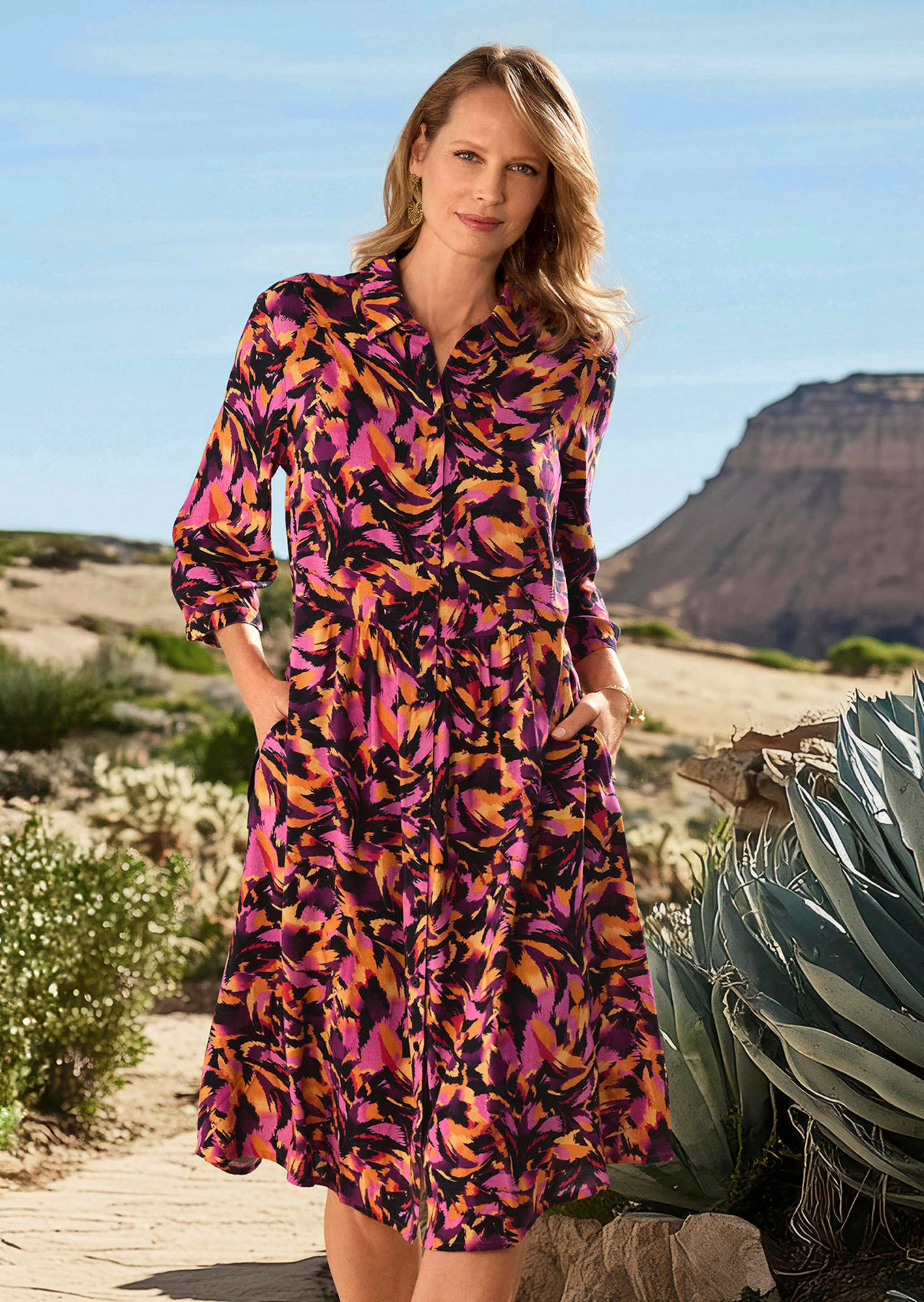 Robe chemisier imprimée. Look décontracté avec col chemise, patte de boutonnage sur toute la longueur et manches 3/4 à poignet boutonné. Silhouette féminine avec couture à la taille qui souligne la silhouette, et partie jupe évasée. Viscose douce et fluide avec imprimé aux tonalités harmonieuses. Longueur env. 106 cm en 46, env. 100 cm en 23.