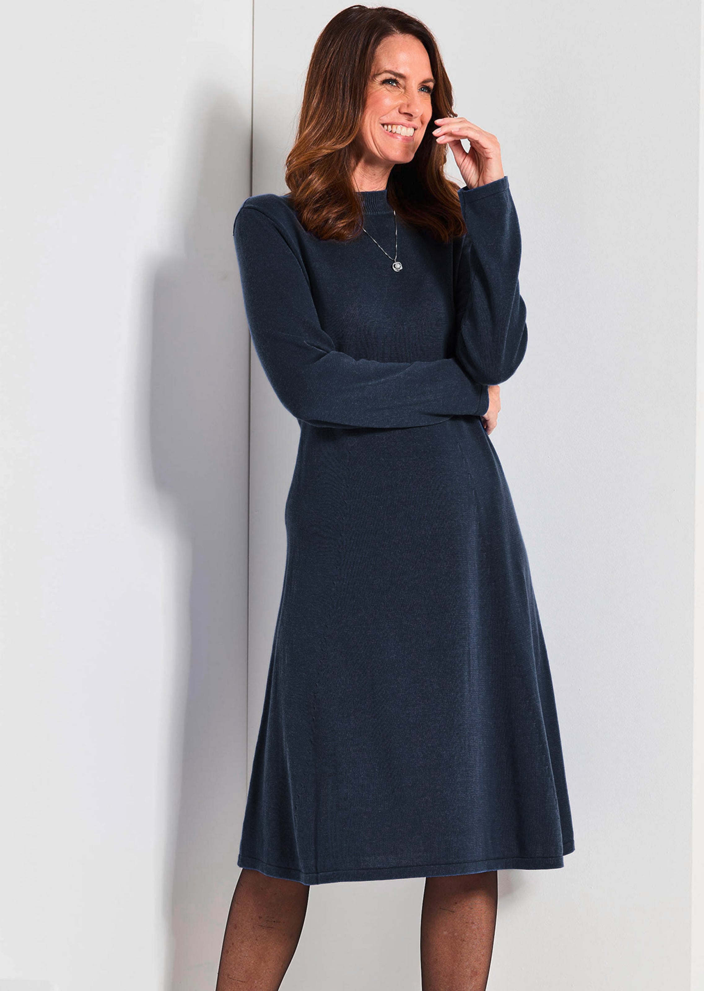 Robe en tricot de haute qualité, réalisée dans une fine maille. Le doux mélange de coton épouse agréablement la silhouette et reste facile d’entretien. Coupe en A avec une jupe ample arrivant au genou, col montant finement côtelé et manches longues aux bords plats. Un modèle polyvalent à combiner, qui vous habille avec style en toutes occasions ! Longueur env. 103 cm en 46, env. 97 cm en 23.