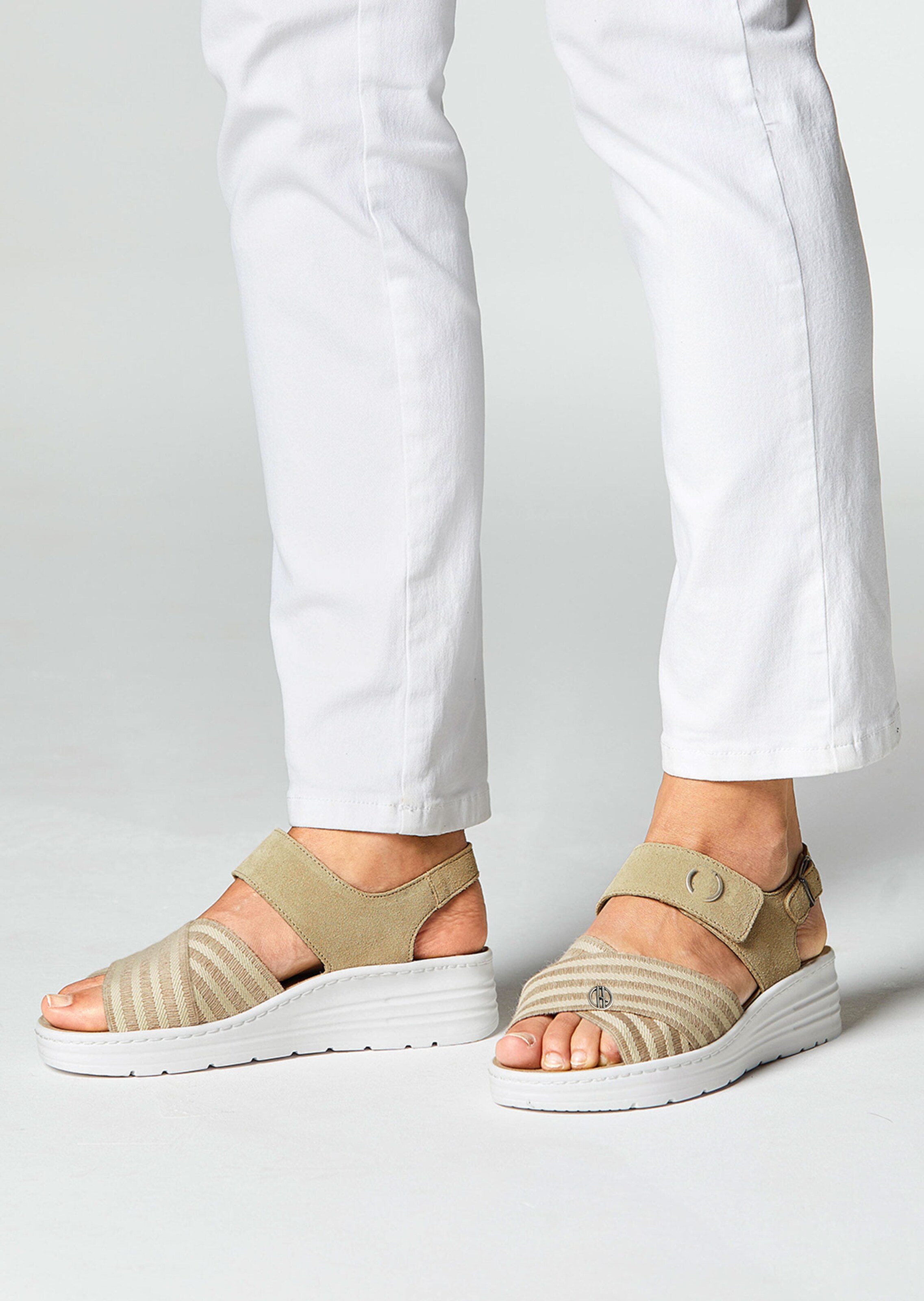 Sandales RIMINI de HICKERSBERGER : des bandes extensibles rayées associées à des lanières avec scratch procurent un excellent maintien. Dessus cuir et textile. La voûte plantaire amovible en textile est antibactérienne et comporte un insert en herbes. Elle est perforée pour permettre aux huiles essentielles d'arriver jusqu'aux pieds. Semelle PU antidérapante.