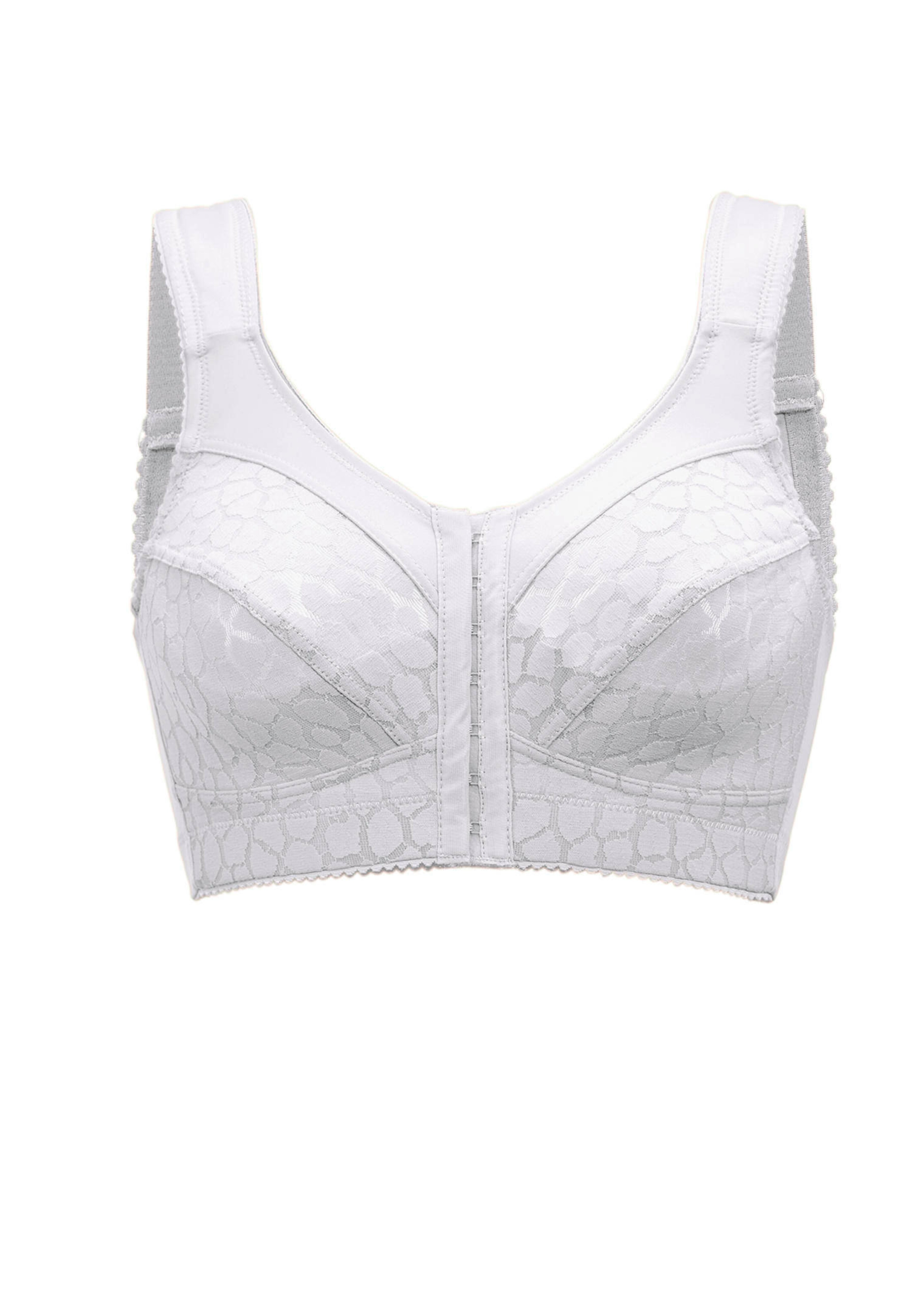 Soutien-gorge avec fermeture à l’avant. Partie avant en jacquard extensible. Structure de maintien ferme, ouatinée, dans les sous-bonnets. Bande large sous la poitrine. Confortables bretelles réglables dans le dos, structure spéciale les empêchant de glisser. Dos extra large en matière ferme.