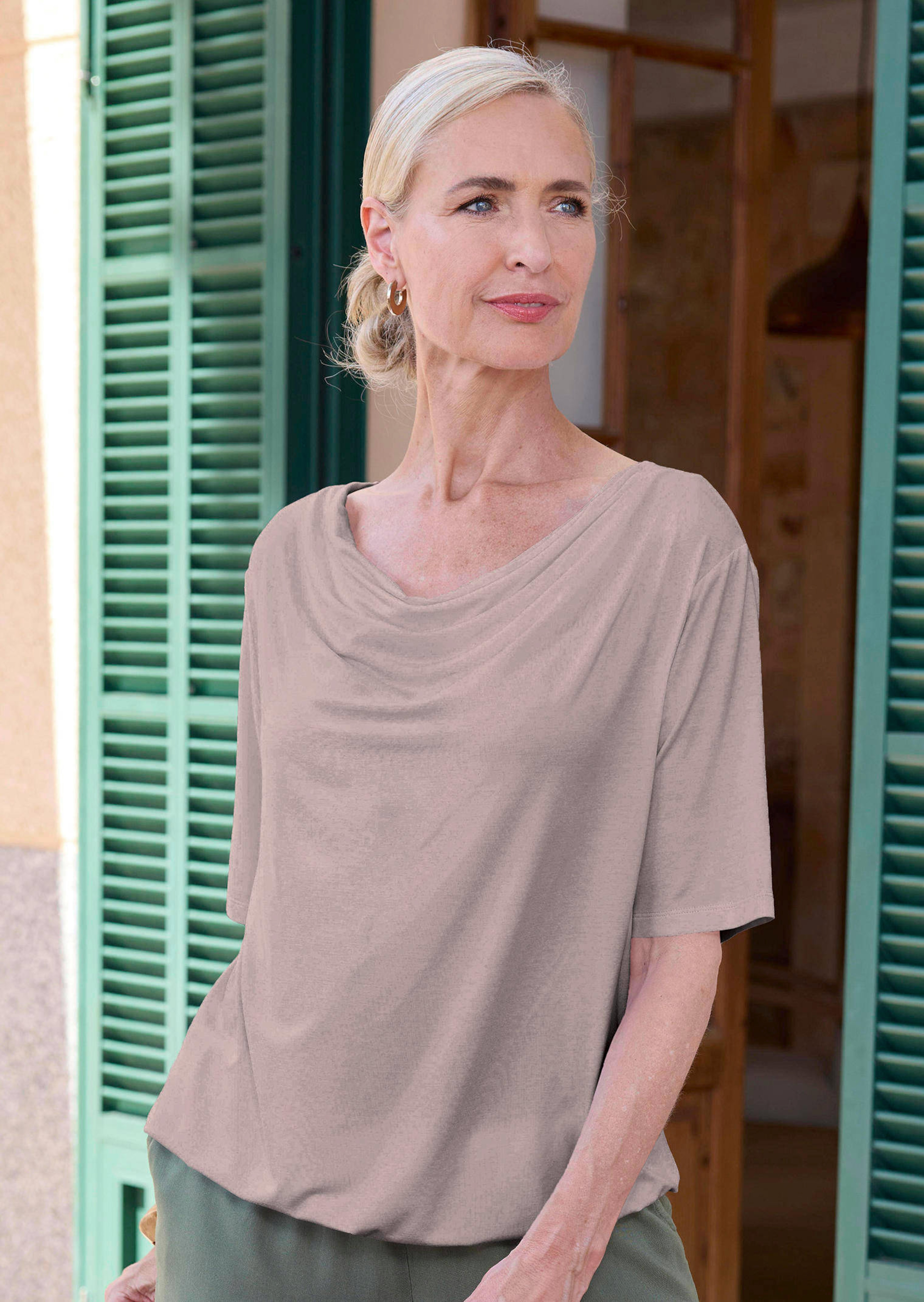T-shirt avec encolure bénitier résolument féminine. En jersey de viscose ultra-doux, au tombé fluide élégant. Manches mi-longues et petite finition élastique à la base permettant de varier le style selon les tenues. Longueur env. 64 cm en 46, env. 60 cm en 23.