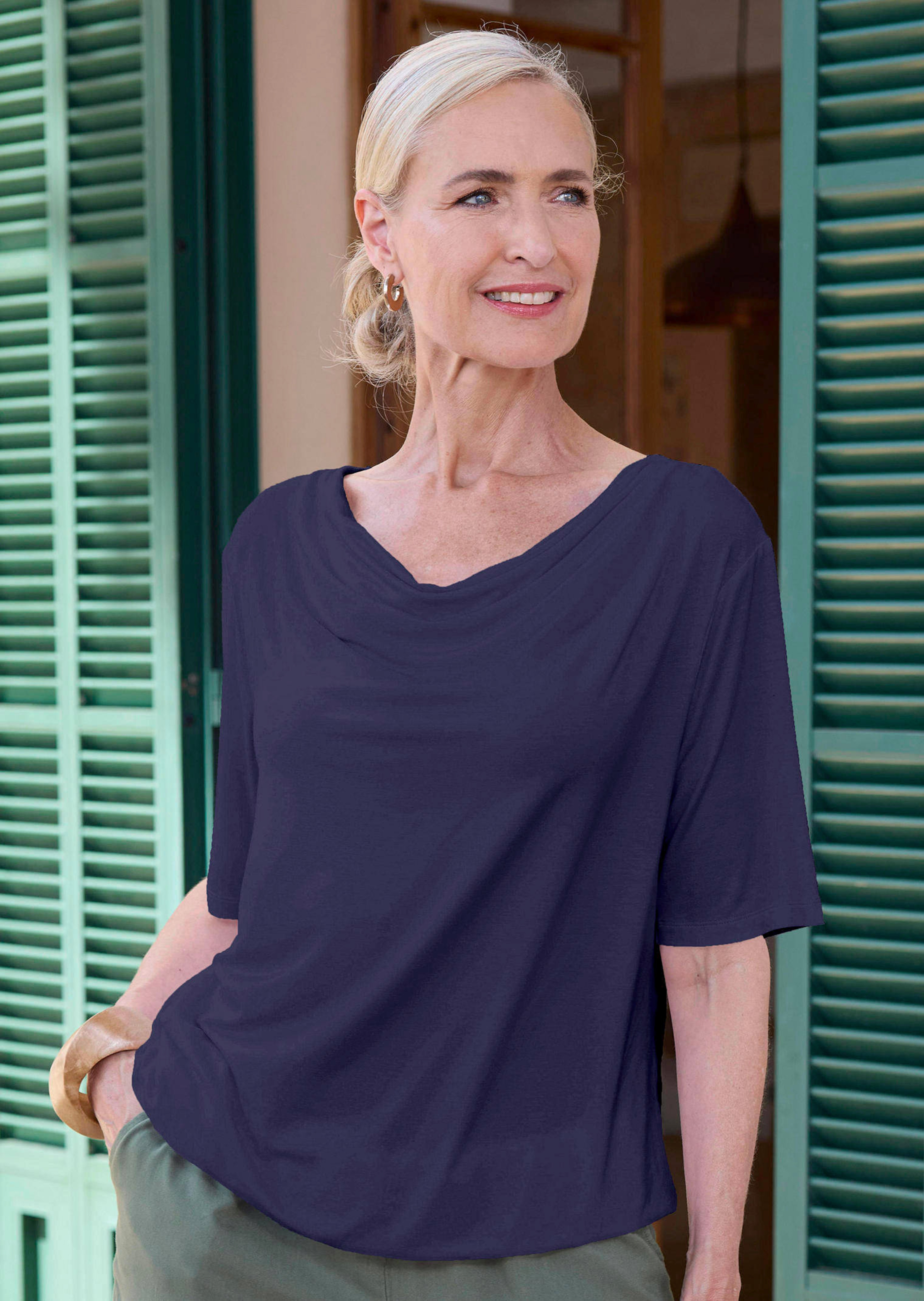 T-shirt avec encolure bénitier résolument féminine. En jersey de viscose ultra-doux, au tombé fluide élégant. Manches mi-longues et petite finition élastique à la base permettant de varier le style selon les tenues. Longueur env. 64 cm en 46, env. 60 cm en 23.