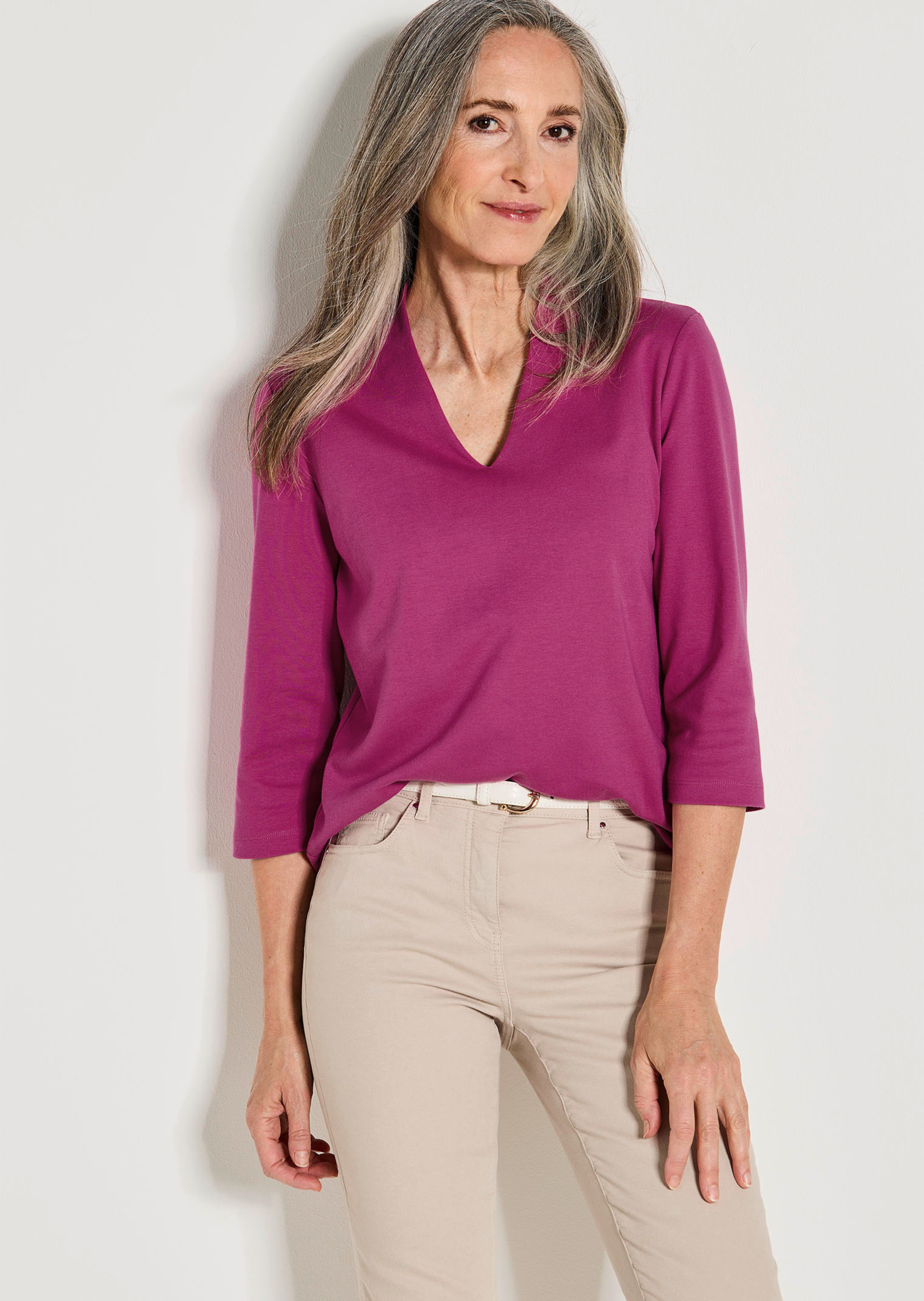T-shirt basique en jersey interlock Belle matiÚre lisse à tissage dense en pur coton agréable au toucher qui garde bien sa forme. Encolure en V flatteuse à effet visuel allongeant, avec garniture intérieure. Coupe droite avec manches 3/4. T-shirt basique facile à combiner avec un blazer ou une veste. Longueur env. 66 cm en 46, env. 62 cm en 23.