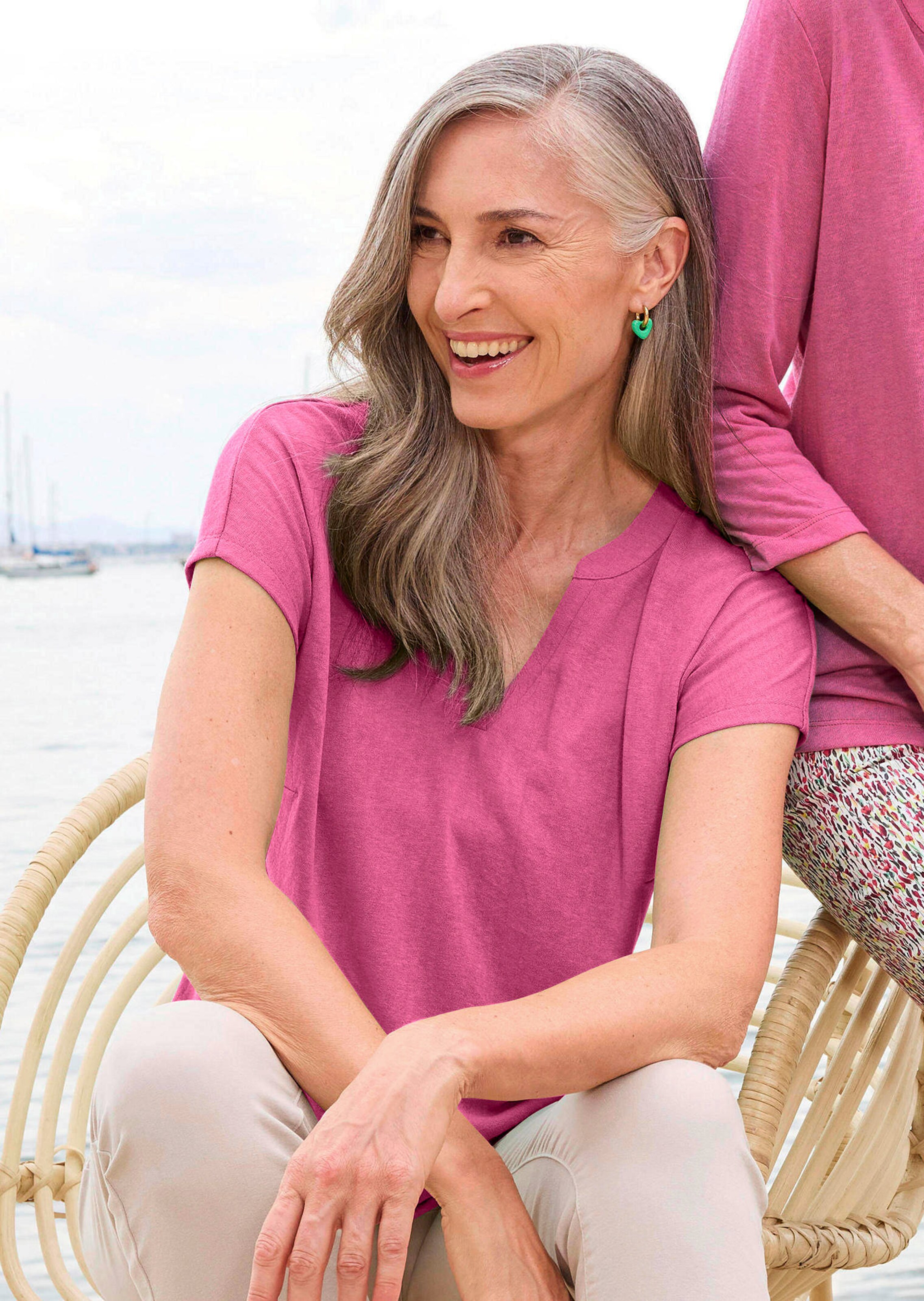 T-shirt en jersey opaque, léger. Texture flammée au toucher légèrement granuleux. Coupe décontractée au confort optimal, avec emmanchures tombantes et finitions droites. Encolure arrondie gansée qui se poursuit en découpe en V à effet allongeant. Un modèle basique tendance, facile à combiner ! Un must pour toute garde-robe ! Longueur env. 66 cm en 46, env. 62 cm en 23.