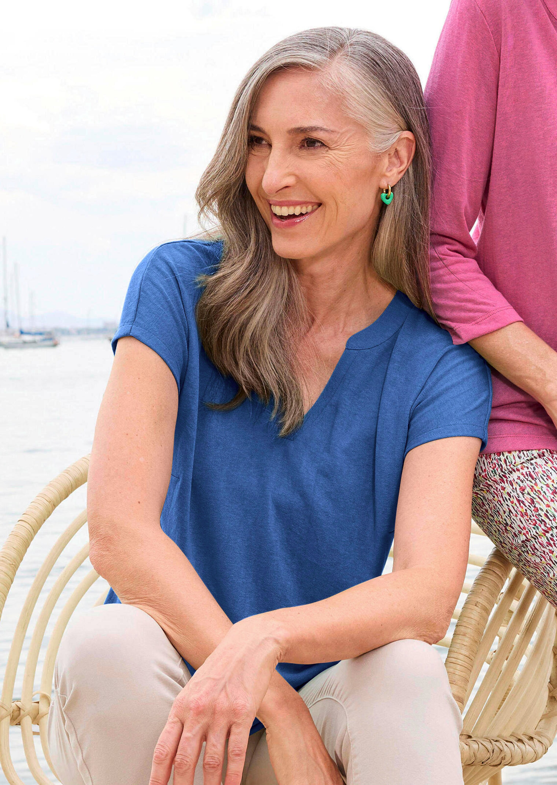 T-shirt en jersey opaque, léger. Texture flammée au toucher légèrement granuleux. Coupe décontractée au confort optimal, avec emmanchures tombantes et finitions droites. Encolure arrondie gansée qui se poursuit en découpe en V à effet allongeant. Un modèle basique tendance, facile à combiner ! Un must pour toute garde-robe ! Longueur env. 66 cm en 46, env. 62 cm en 23.