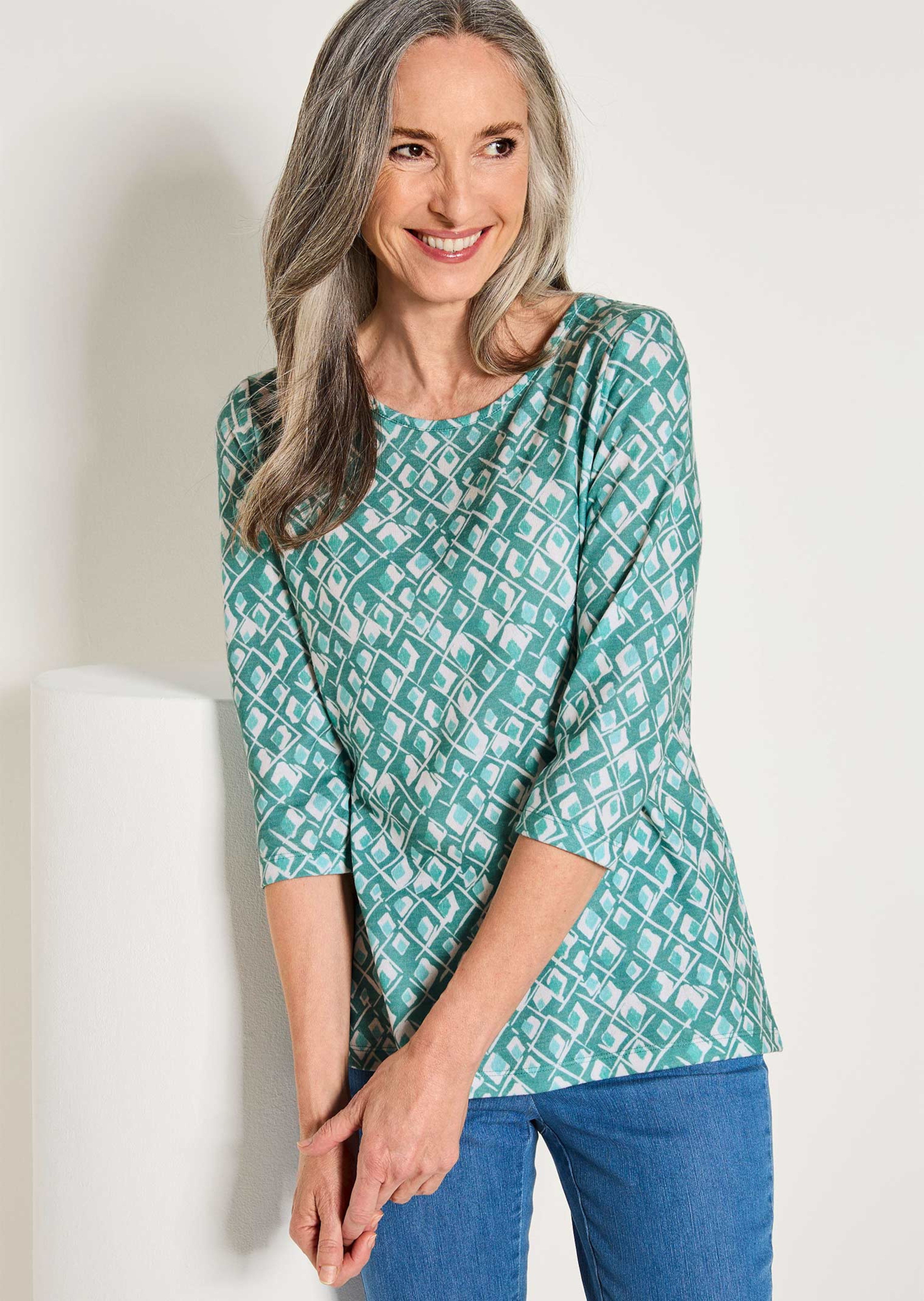 T-shirt imprimé avec motif graphique aux tonalités harmonieuses, très facile à associer, permettant de créer des tenues chics et variées. Coupe droite avec encolure bateau, finitions droites et manches 3/4. Jersey moelleux avec teneur en viscose offrant une sensation de confort maximal ! Longueur env. 66 cm en 46, env. 62 cm en 23.
