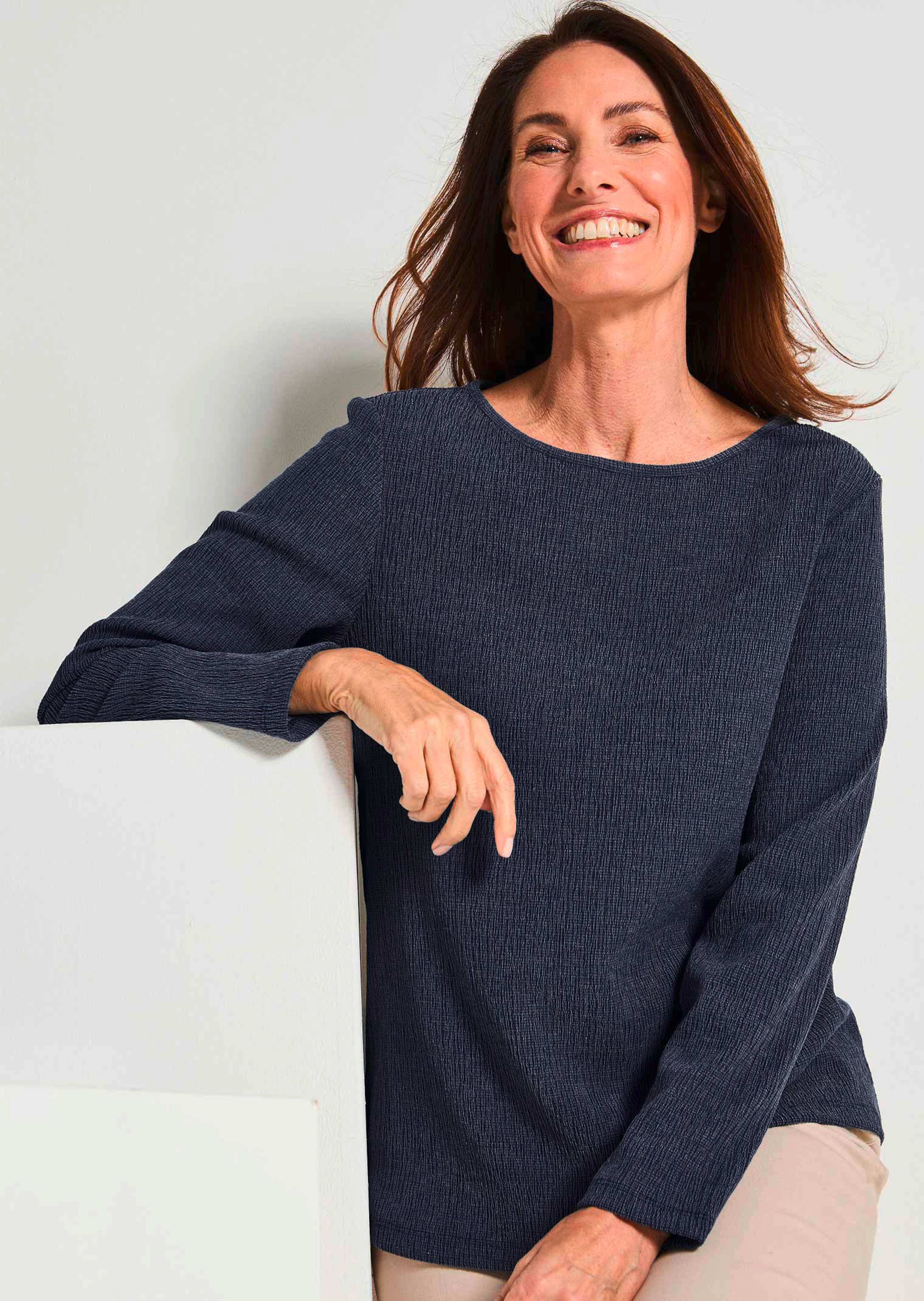 T-shirt en jersey avec teneur en viscose. Belle matière structurée façon crêpe, à effet chatoyant. Coupe droite avec encolure bateau et manches longues. Un modèle basique indispensable pour sublimer votre garde-robe ! Longueur env. 66 cm en 46, env. 62 cm en 23.