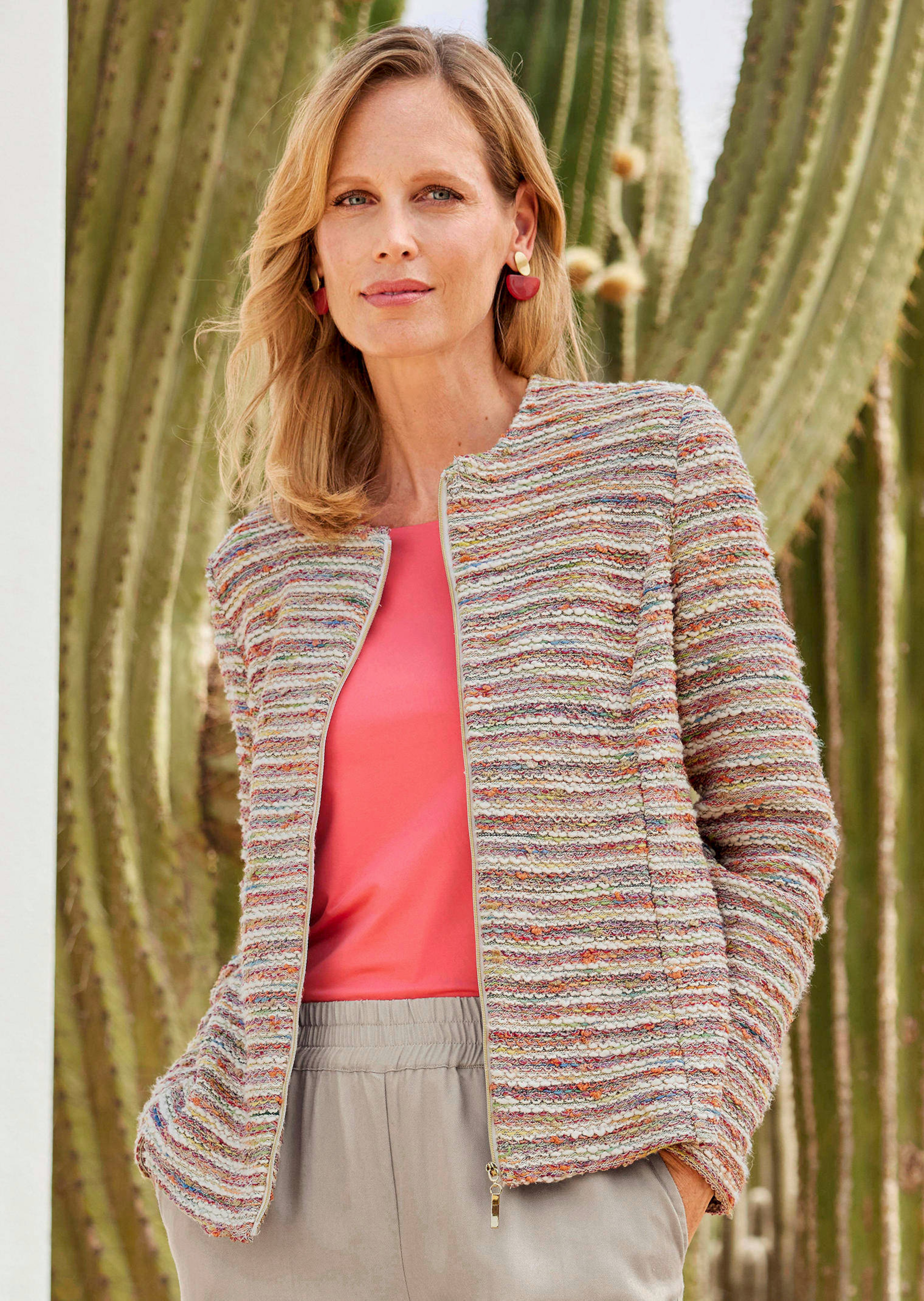 Veste raffinée, aspect bouclette. Matière structurée agrémentée d’un motif à rayures multicolores séduisant. Jersey extensible agréable à porter avec teneur en coton et viscose. Encolure arrondie et zip, coloris or. Coupe près du corps avec coutures à effet galbant devant et au dos. Coup de cœur facile à associer à porter en de nombreuses occasions ! Longueur env. 62 cm en 46, env. 59 cm en 23.