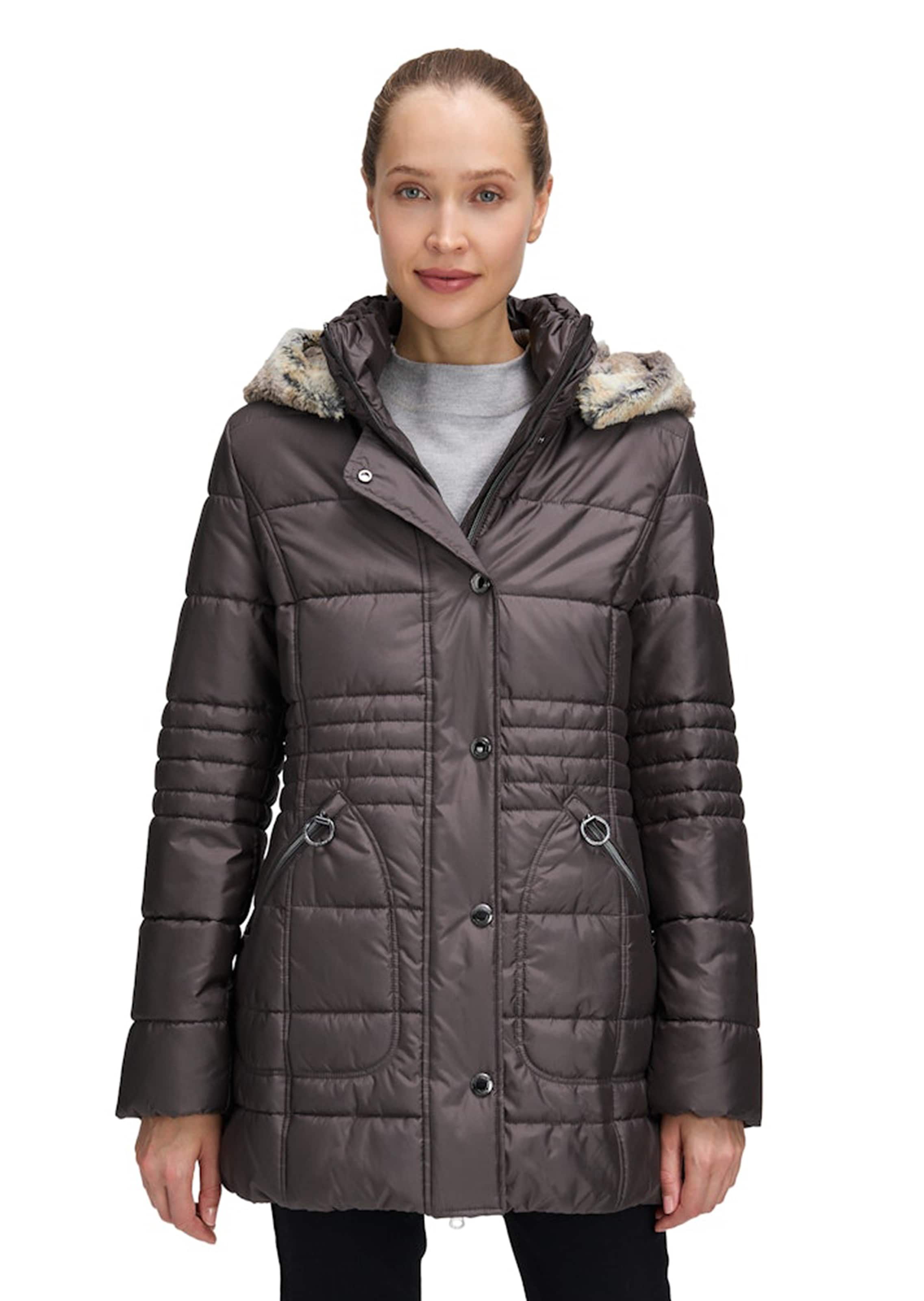 Doudoune à capuche BETTY BARCLAY. La capuche est amovible, doublée de fausse fourrure toute douce et ajustable en largeur. Ce modèle féminin présente une coupe près du corps, avec des coutures de séparation verticales qui allongent la silhouette et un matelassage cintré à la taille. Rembourrée de duvet synthétique, la veste tient agréablement chaud. Le zip de fermeture va-et-vient, souligné d’un ruban de velours et protégé par une patte à boutons-pression, offre une protection supplémentaire contre le froid. Les grandes poches zippées, doublées et bien chaudes, ainsi que la poche intérieure permettent de ranger vos objets de valeur en toute sécurité. Longueur env. 80 cm en 46.