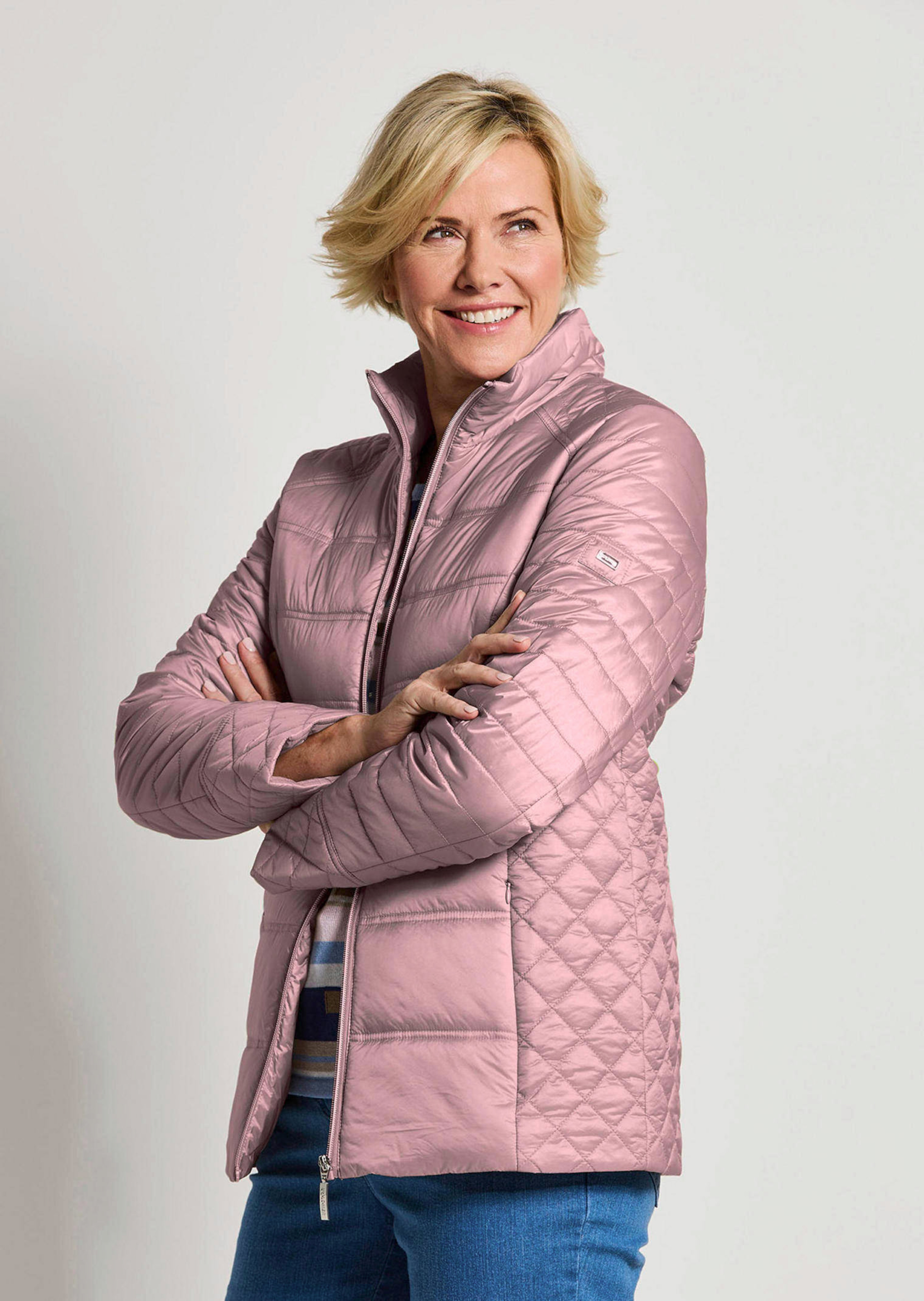 Veste matelassée. Mix de motifs surpiqués : empiècements latéraux surpiqués en losange à effet visuel amincissant ; devant, dos et manches avec surpiqûres transversales. Légèrement ouatée, cette veste offre une protection optimale contre le vent grâce au col montant haut et à la fermeture zippée. Deux poches zippées sous coutures et deux poches intérieures pour les petites choses inévitables du quotidien. Longueur env. 71 cm en 46, env. 67 cm en 23.