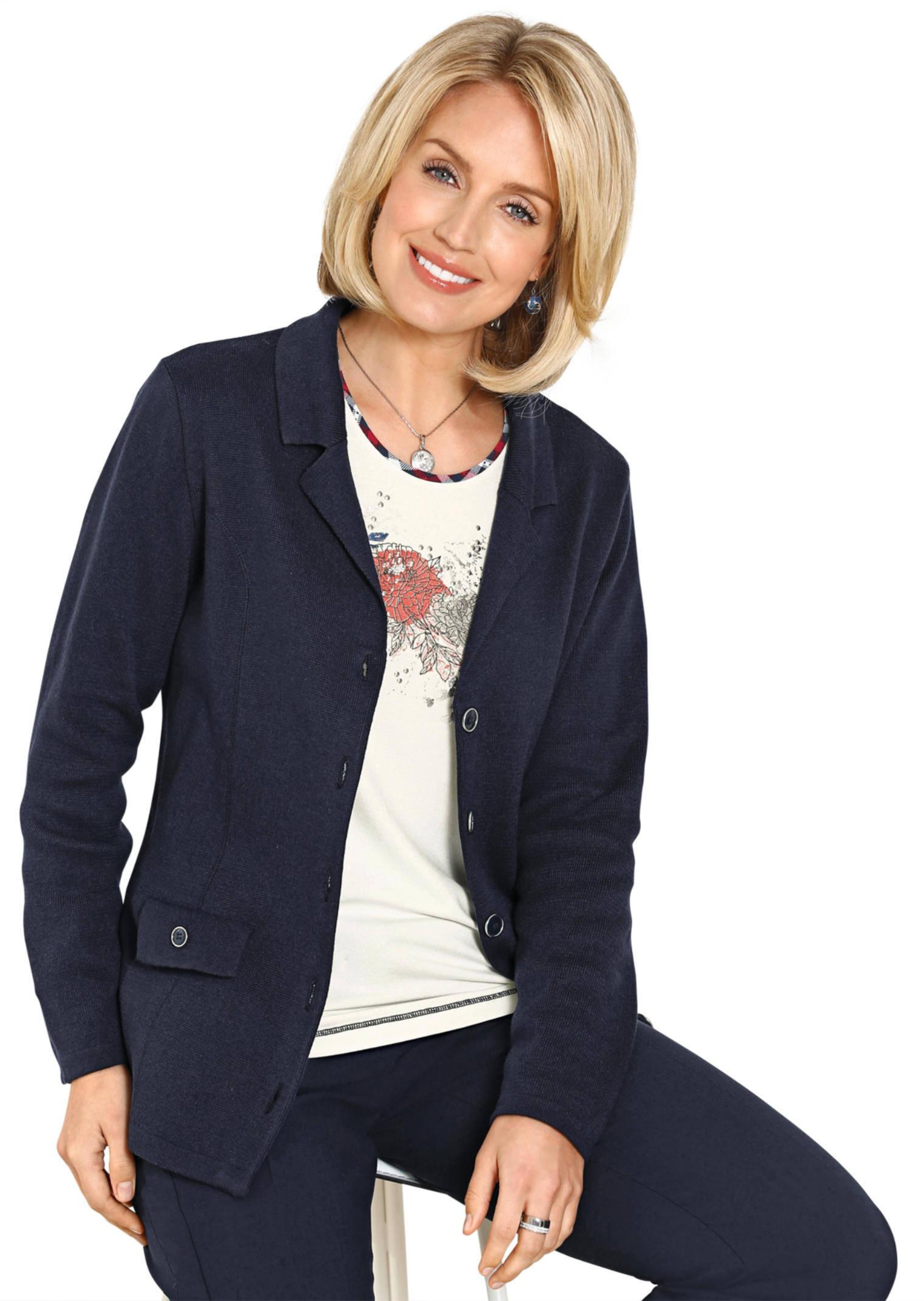 Ce blazer en tricot se distingue par sa douceur sur la peau et l'indéformabilité du coton mélangé. Ravissants boutons à anneau couleur argent, coutures princesse à l'avant et dans le dos pour un tombé parfait, bords en tricot lisse, col à revers, manches longues, poches à rabat. Longueur env. 70 cm en 46, env. 66 cm en 23.
