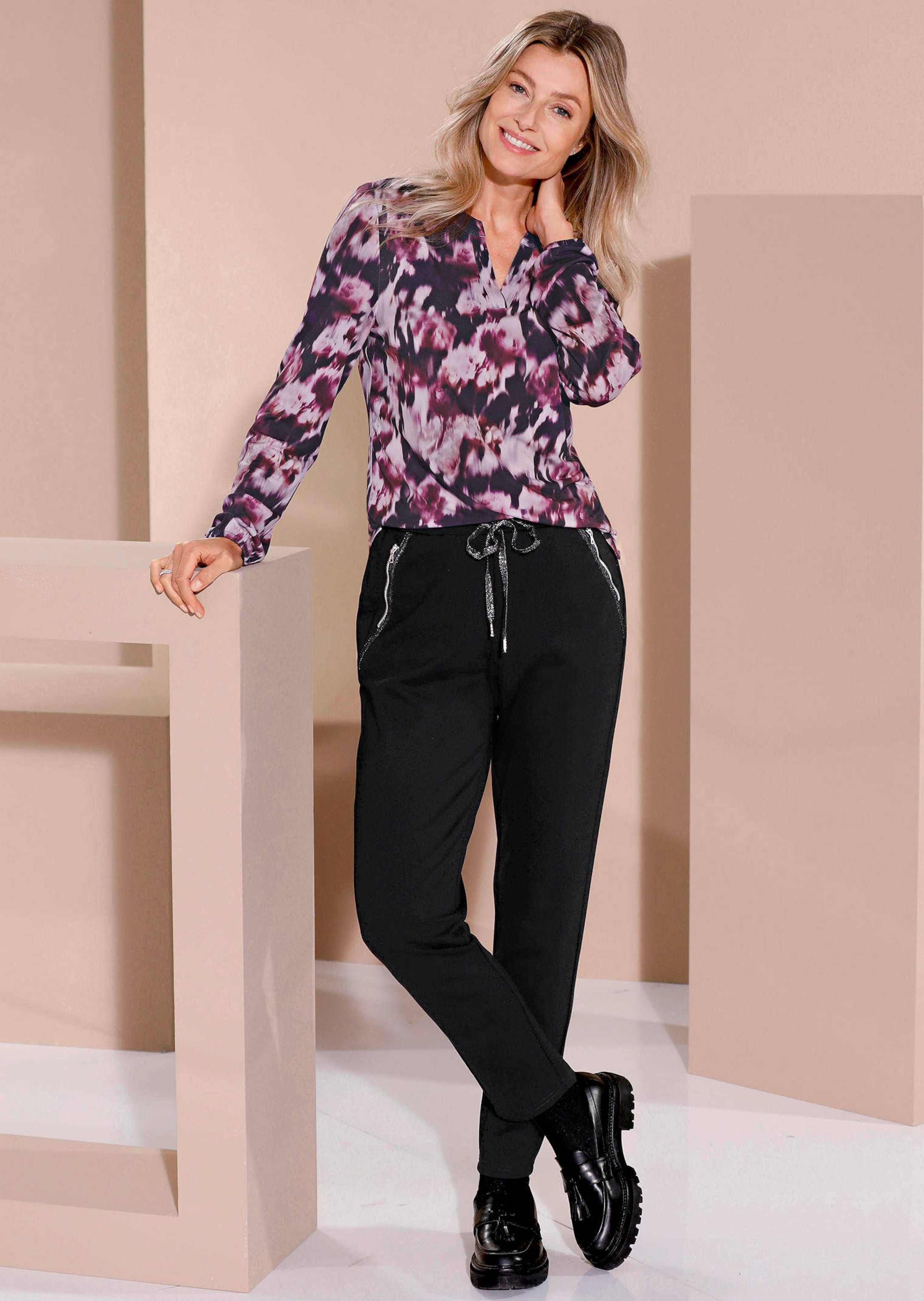 Chemisier en jersey parcouru d'un ravissant mélange de motifs, très bien mis en valeur par le beau tissu slinky. Un modèle qui accompagnera avec brio de nombreuses tenues différentes. L'Elasthanne permet de profiter d'une totale liberté de mouvement. Ravissante encolure en V, empiècement froncé aux épaules. Longueur env. 69 cm en 46, env. 65 cm en 23.