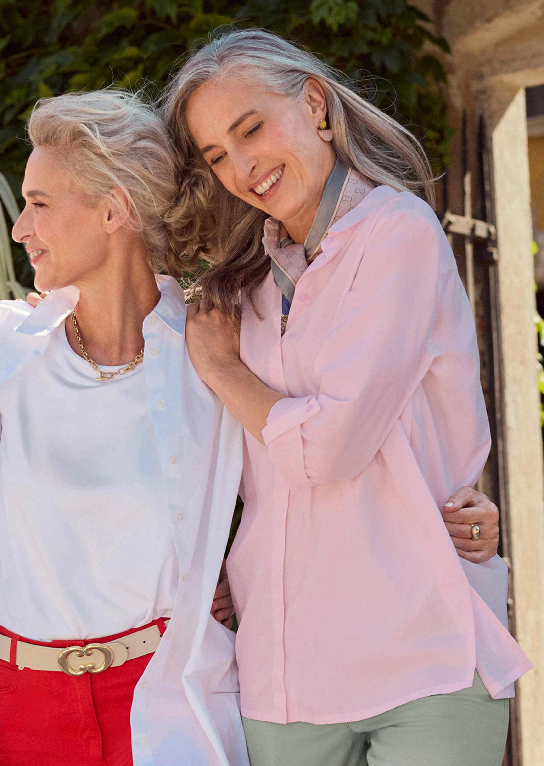 Chemisier popeline pur coton, légère et aérée. Coupe longue flatteuse avec fentes latérales. Facile à combiner avec un pantalon ajusté. Ce chemisier polyvalent peut se porter fermé ou ouvert, façon surchemise. Manches longues à retrousser sur bride boutonnée. Longueur env. 73 cm en 46, env. 69 cm en 23.