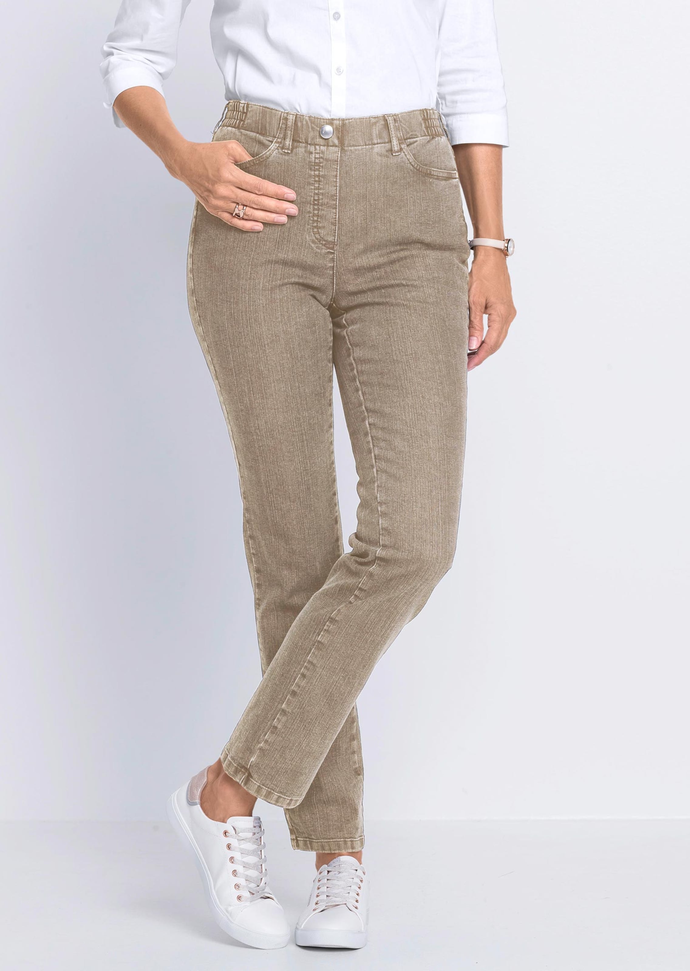 Jean CARLA ultra-confortable avec taille partiellement élastique. Modèle soigné, confectionné dans une matière innovante, extensible en long et en large, offrant une liberté de mouvements maximale. Coupe séduisante avec poches arrondies, devant, et deux poches au dos ornées de rivets décoratifs. Avec empiècement à la taille au dos garantissant une coupe parfaitement seyante. Largeur au bas env. 42 cm. Coupe droite.