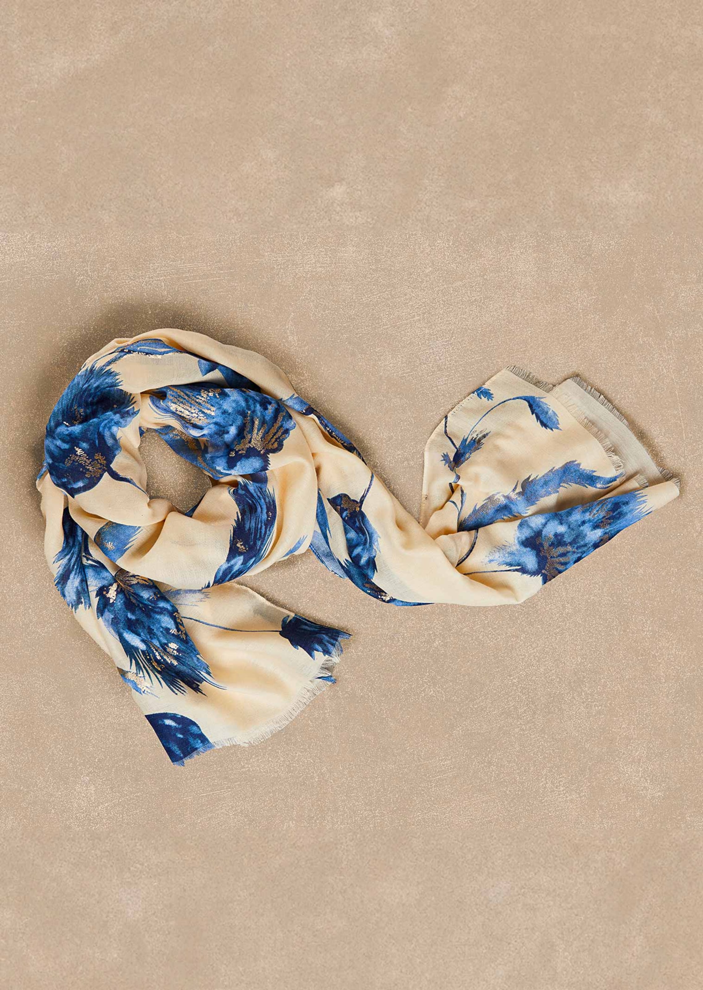 Foulard à motif floral. Le magnifique motif de fleurs sur fond clair apporte une touche de fraîcheur, tandis que l'impression dorée ajoute une note élégante et chic. Bords frangés. Un excellent partenaire de combinaison en voile doux et facile d'entretien, qui se porte agréablement et illumine votre tenue !