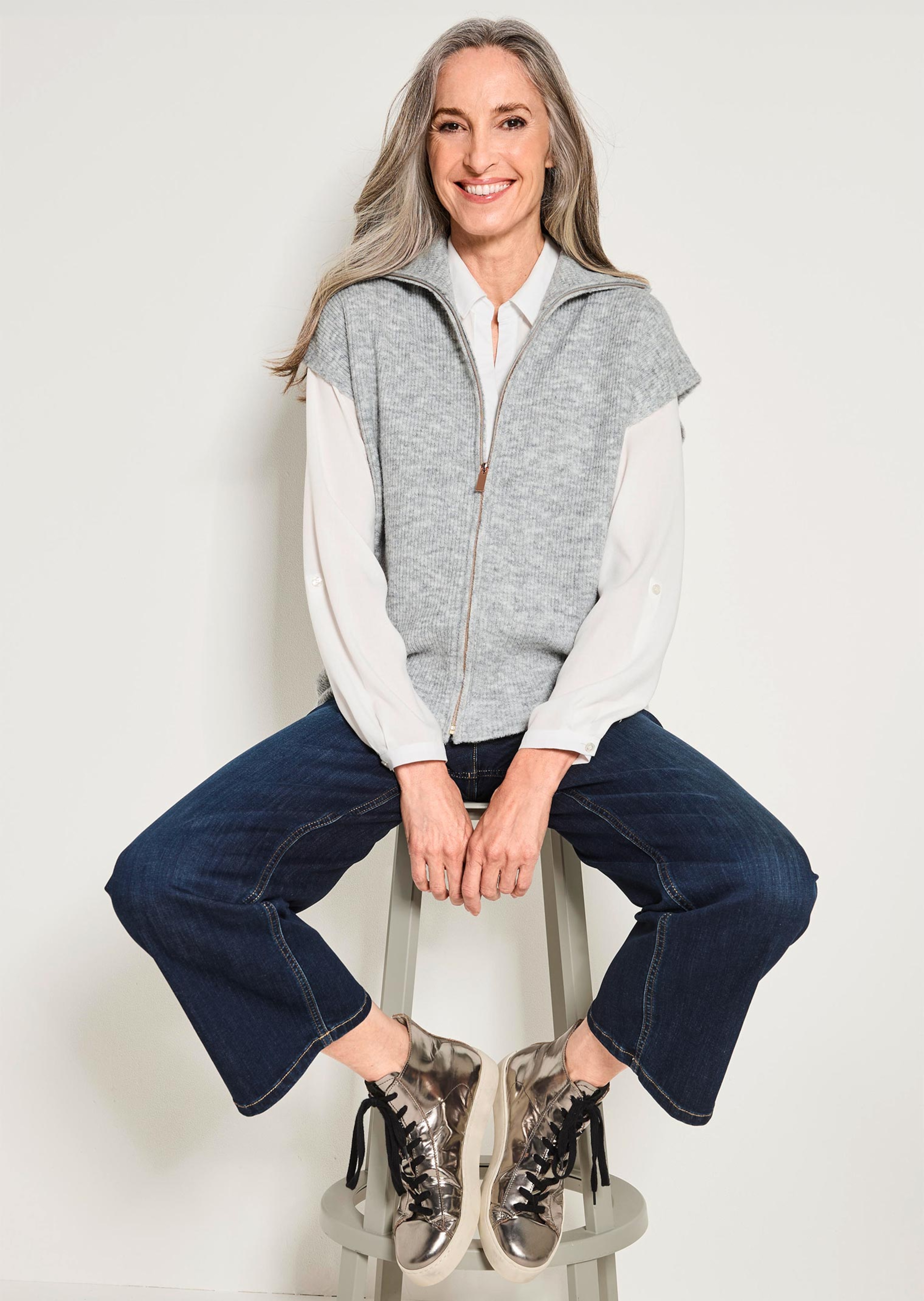 Gilet en tricot, façon débardeur. Forme décontractée avec emmanchures tombantes. Il se combine à merveille avec une blouse ou un T-shirt. Fermeture zippée sous patte avec bande en tricot : à porter ouvert ou fermé selon vos envies. Col généreux variable agréable pouvant se porter aussi bien roulé que rabattu. Mix chiné douillet et facile d’entretien à la structure côtelée. Longueur env. 65 cm en 46, env. 61 cm en 23.