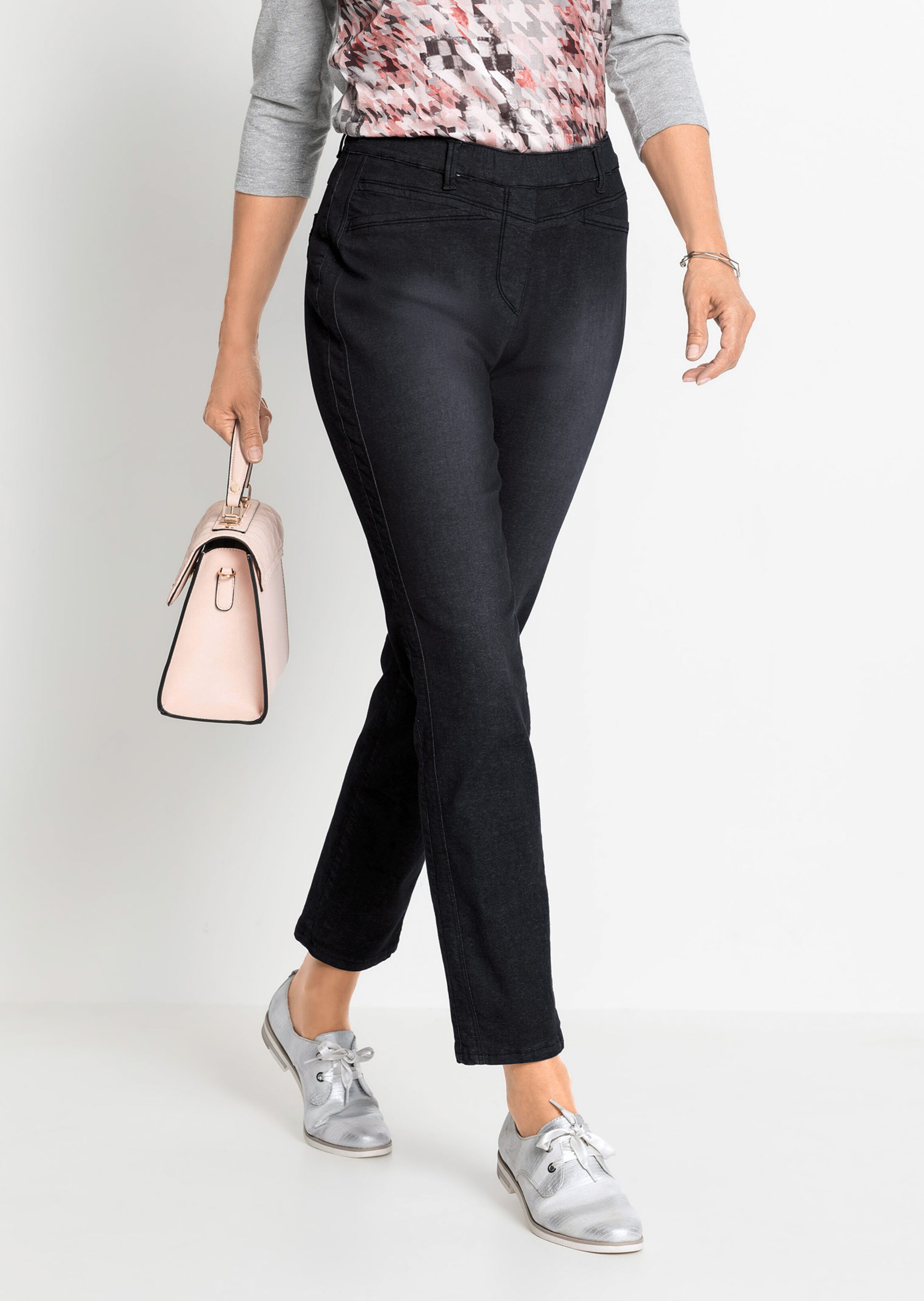 Le jean vous offre une totale liberté de mouvement grâce à sa taille entièrement élastique et au tissu super extensible à pourcentage élevé de coton. Des coutures décoratives sur les côtés allongent visuellement la silhouette et un renfort à l'avant et à l'arrière procure une tenue impeccable. Passants de ceinture, piqûres décoratives, poches factices à l'avant, poches plaquées à l'arrière. Largeur au bas env. 34 cm. Jambes fines.