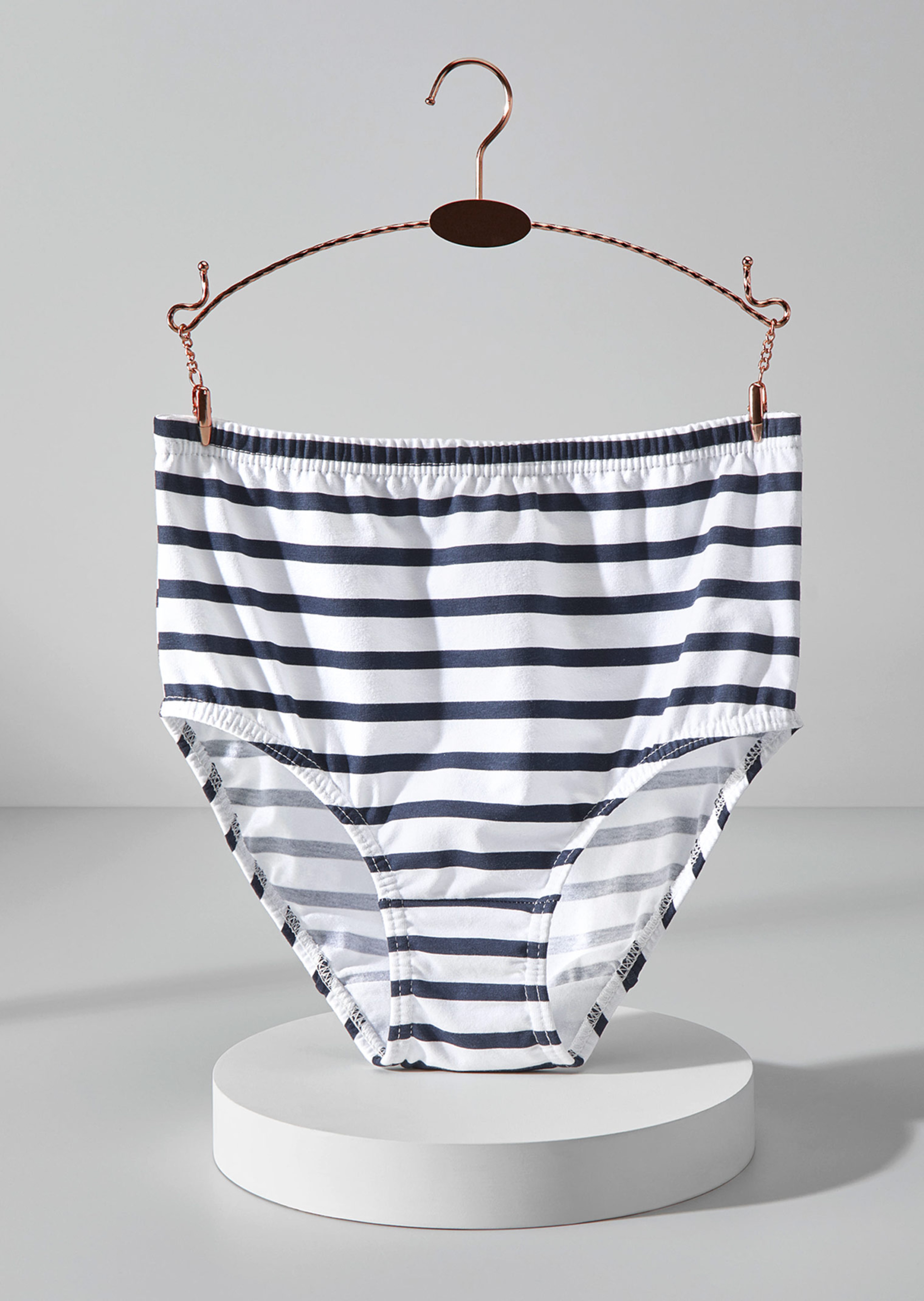 Lot de 7 slips taille basse. Lot composé de 4 slips à rayures et de 3 slips blancs. Idéal pour passer la semaine. La taille tombe à environ deux doigts sous le nombril. Larges côtés et échancrure modérée aux jambes. Belle qualité de bonne tenue en coton et élasthanne. Fond double épaisseur.
