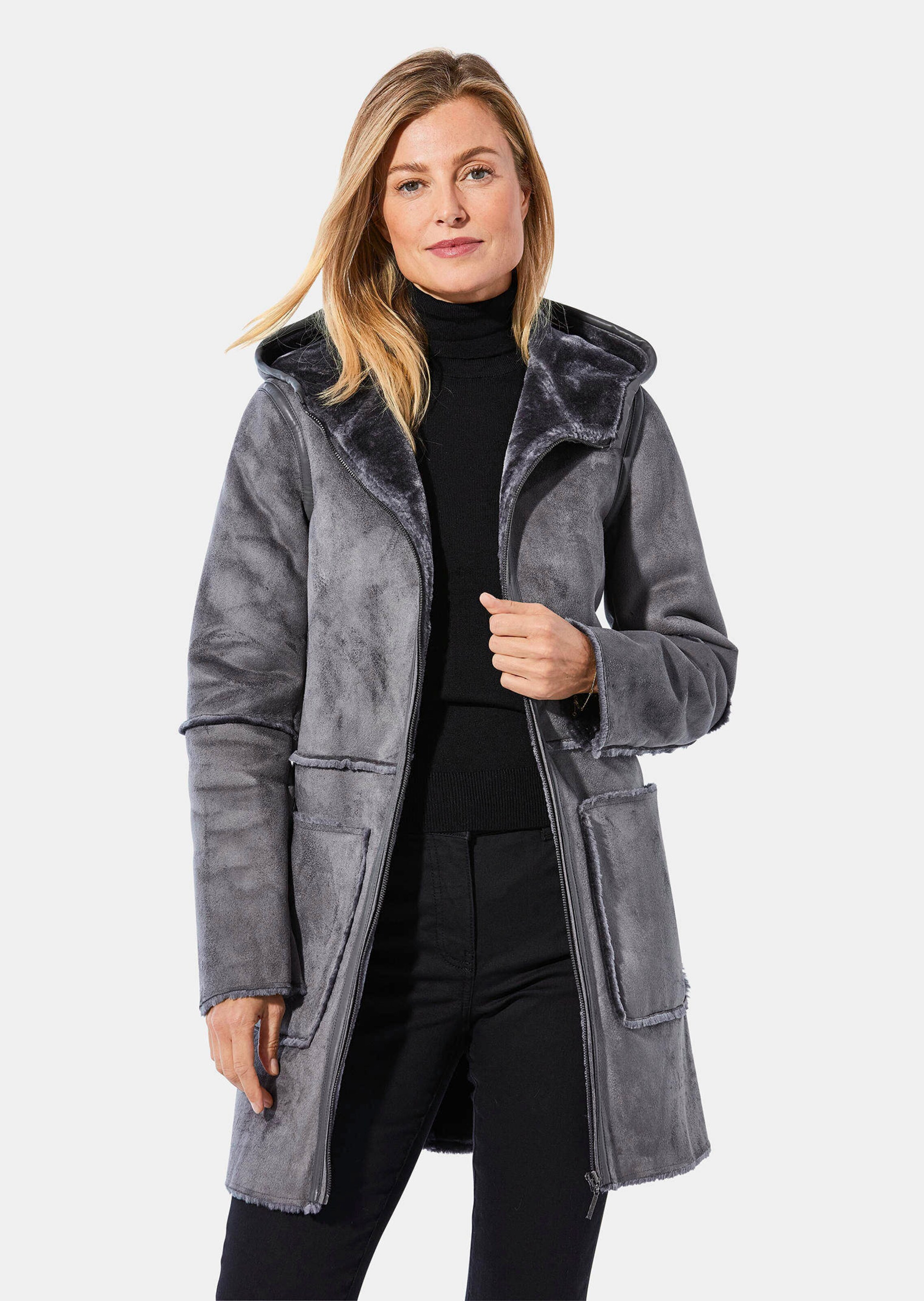 Manteau à capuche en similicuir suédé du plus bel effet, avec doublure chaude et moelleuse en peluche. Les coutures des épaules et des manches ainsi que les coutures de la fermeture zippée sont renforcées par du similicuir. La capuche séduisante est également bordée de similicuir. Les coutures restantes sont agrémentées de fourrure synthétique. Une attention toute particulière a été portée aux grandes poches plaquées et à la couture décorative transversale, qui est reprise aux manches. Belle coupe longue avec col montant et fermeture zippée. Un partenaire chic et cosy pour braver l'hiver. Taille petit : veuillez commander une taille au-dessus de votre taille habituelle.