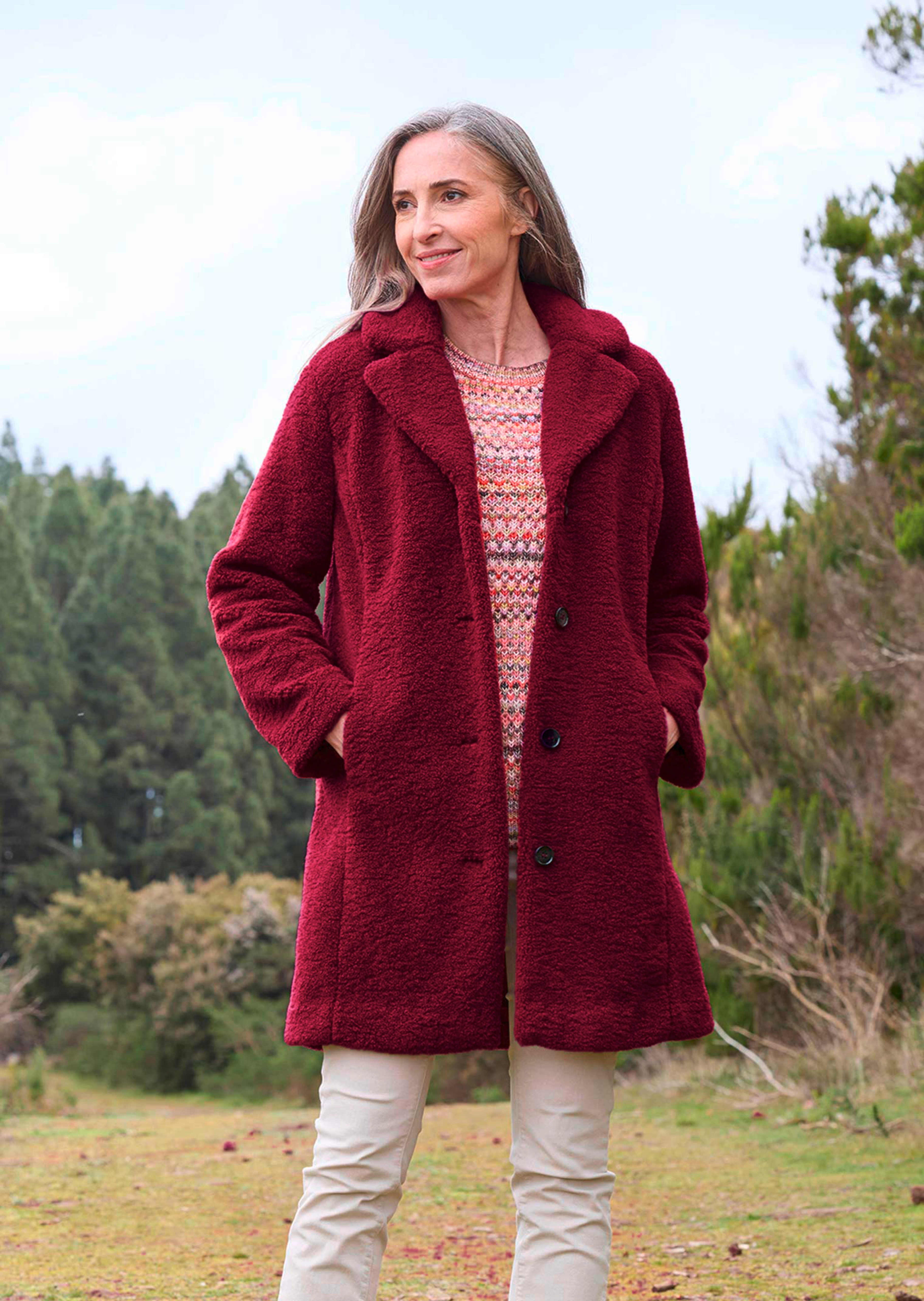 Manteau aspect fourrure en peluche douillette. Coupe classique avec col tailleur et boutons contrastants. Un must pour braver le froid en beauté. Silhouette séduisante, parfaitement seyante. Deux poches sous couture et doublure avec poches intérieures pour les petites choses indispensables du quotidien. Longueur env. 93 cm en 46, env. 89 cm en 23.