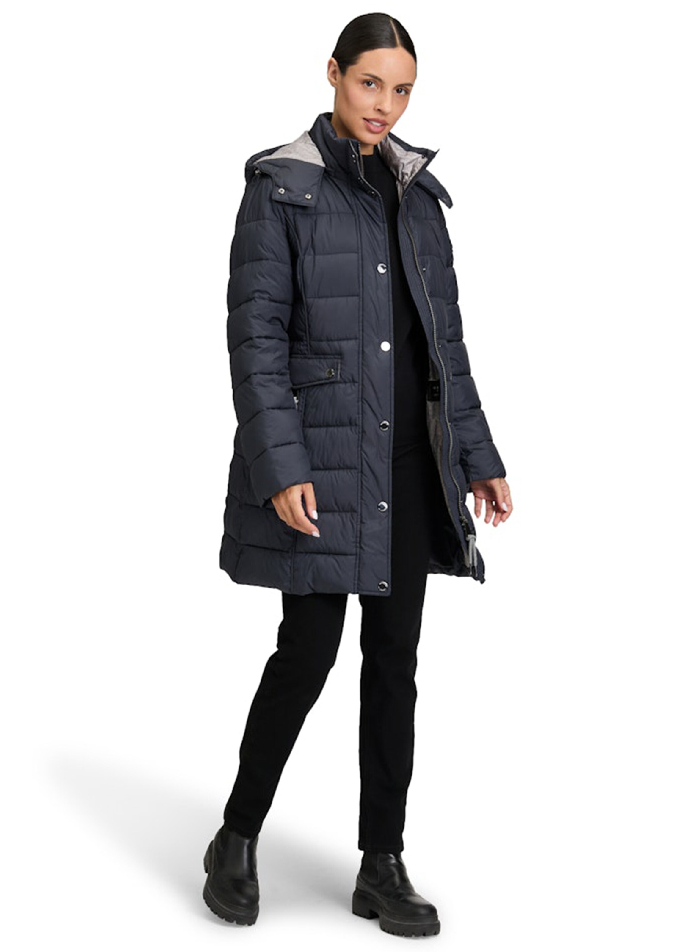 Manteau matelassé avec capuche de la marque BETTY BARCLAY, en coupe droite avec des coutures de séparation allongeantes. Grâce à son épais rembourrage en duvet synthétique, ce modèle tient agréablement chaud. La capuche, ajustable, se retire facilement grâce à un zip. Le zip de fermeture va-et-vient protégé par une patte de boutonnage, offre une excellente protection contre le vent. Les doubles poches à rabat et zip sont à la fois pratiques et stylées, idéales pour garder vos objets de valeur en sécurité. Petit plus esthétique : les détails et cordons de couleur anthracite, très élégants ! Longueur env. 88 cm en 46.