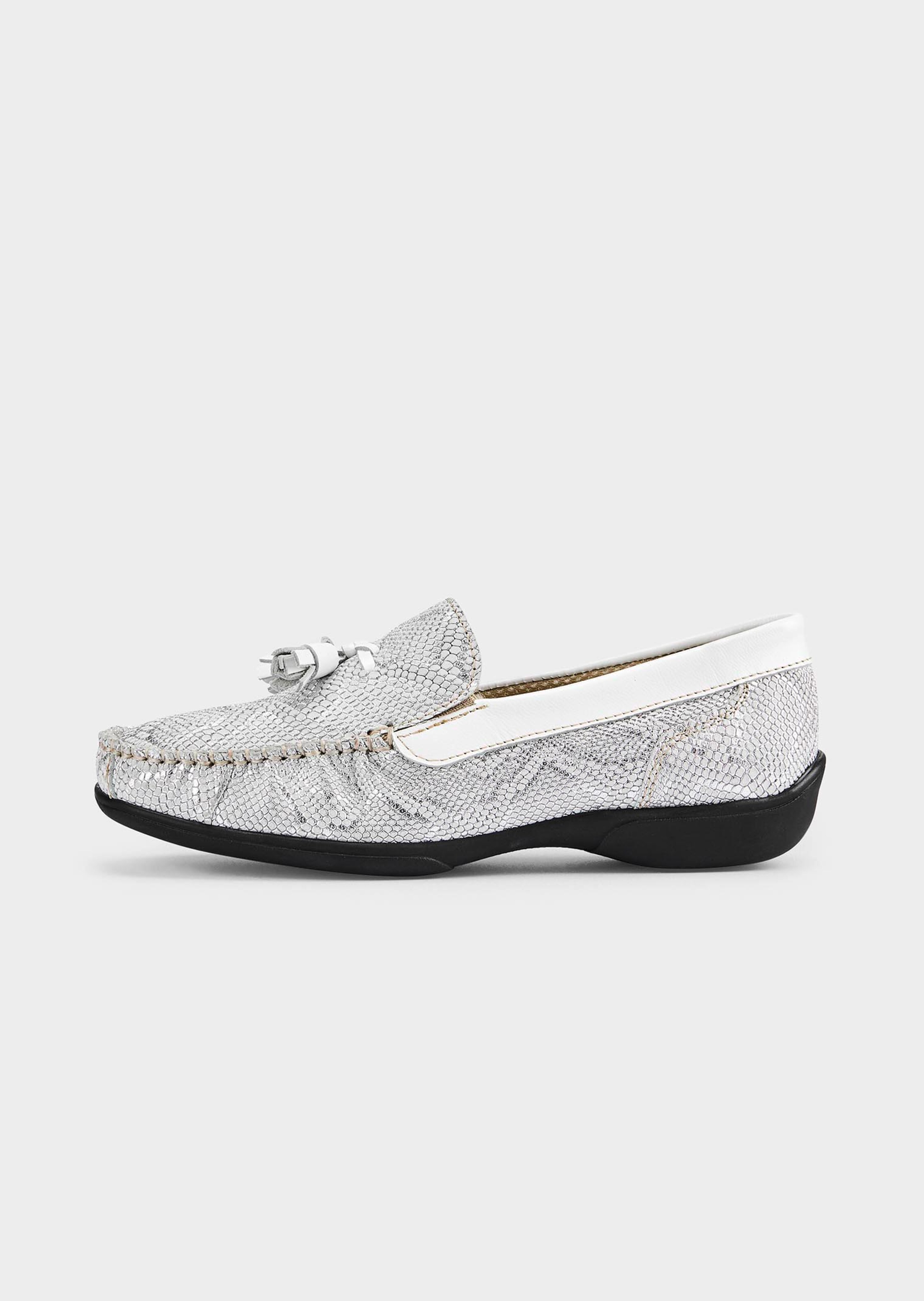 Mocassins aspect reptile. Modèle classique avec pompon typique agrémenté d’un motif reptile très tendance ! Dessus et première en cuir véritable. Doublure en synthétique. Semelle extérieure EVA très douce qui amortit les chocs à chaque pas. Voûte plantaire amovible.