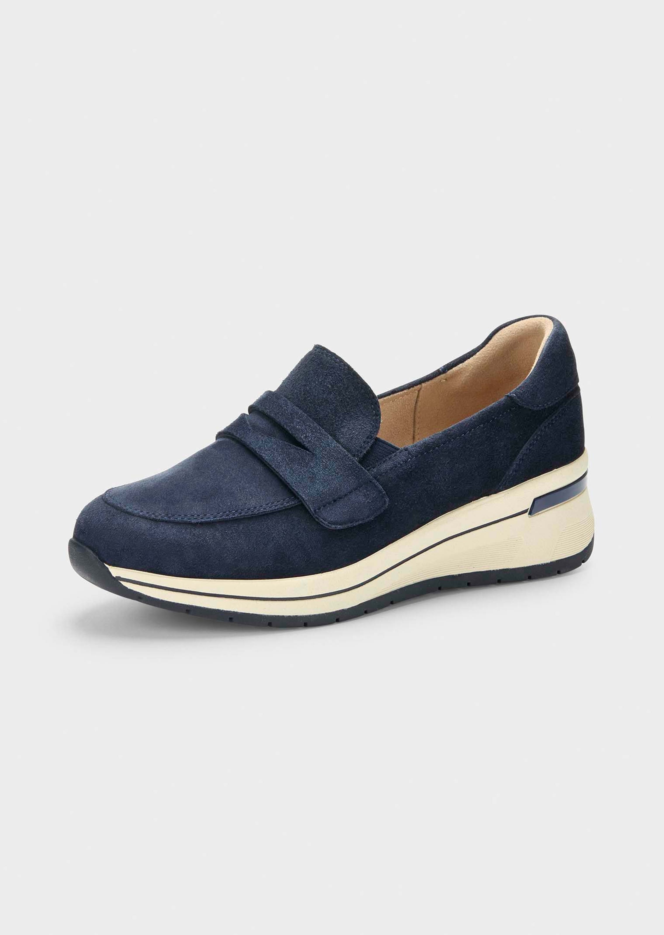 Mocassins de CAPRICE en cuir suédé véritable. Look décontracté avec semelle contrastante en synthétique. Empiècements extensibles sur les côtés pour un confort maximal. Finition intérieure en textile et voûte plantaire interchangeable. Talon compensé agréable.