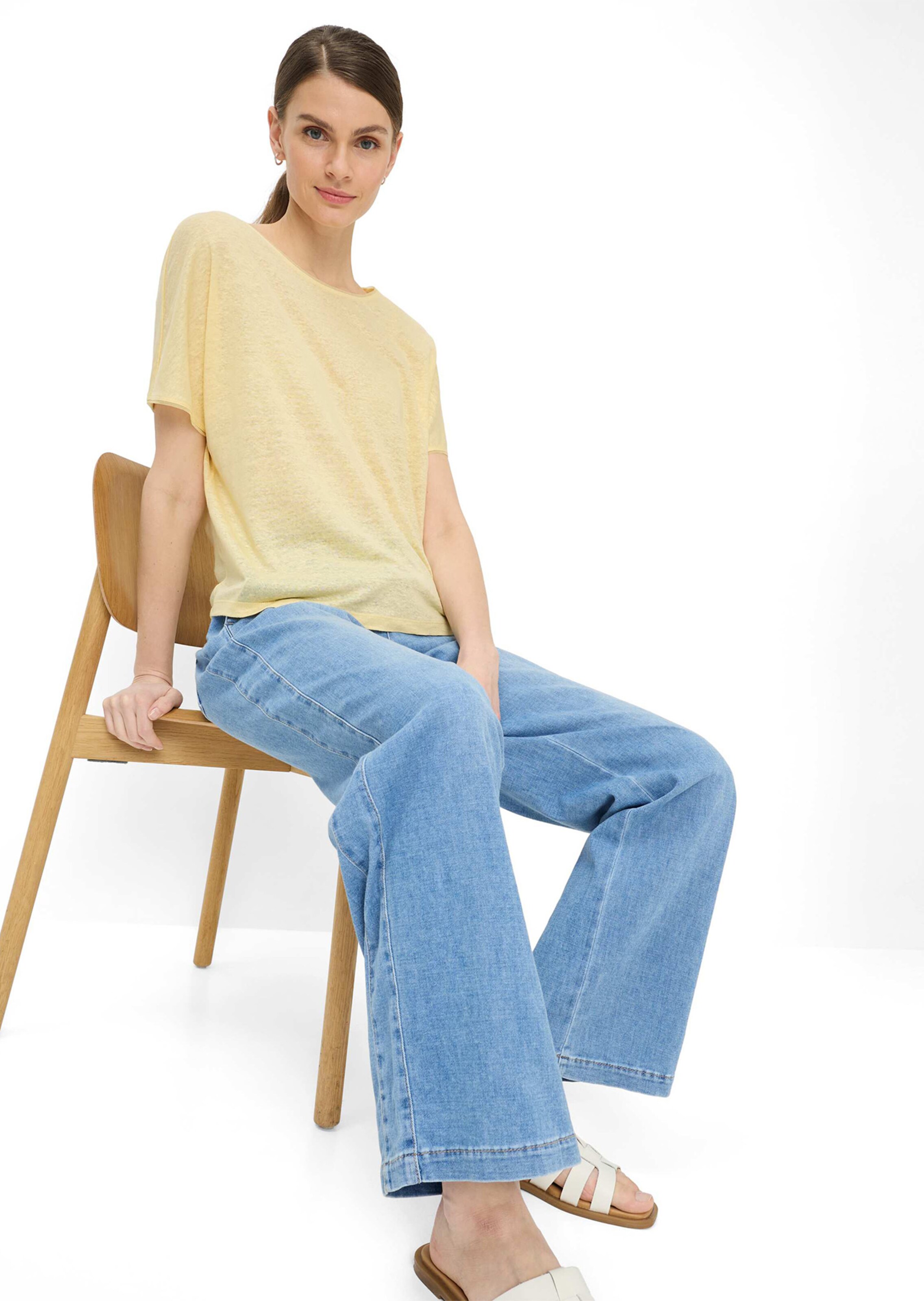 Jean BRAX avec taille entièrement élastique réalisé en denim estival doux et léger, parfait pour la belle saison. Facile à enfiler et à retirer grâce à la taille élastique agrémentée de passants pour ceinture. Les jambes amples confortables et le délavage clair, très tendance, apportent une touche estivale à l’ensemble. Un jean parfait, avec poches latérales et poches plaquées au dos. Largeur au bas env. 54 cm en 46.