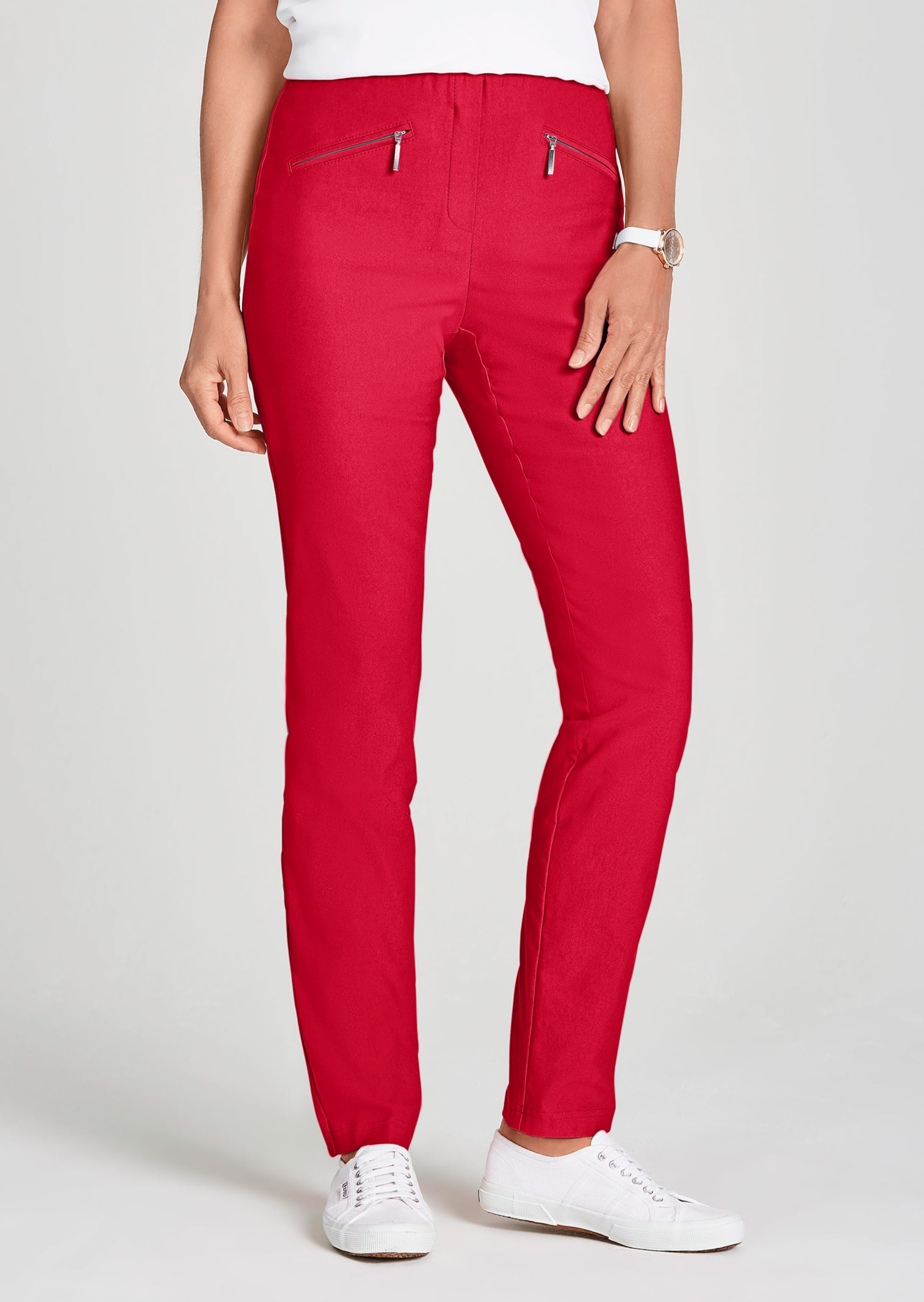 Le pantalon en bengaline LOUISA avec taille entièrement élastique est extensible dans tous les sens et suit tous les mouvements. La part de coton offre un confort maximal. Avec deux poches zippées obliques et un zip factice. Longueur, taille comprise. Largeur au bas env. 36 cm. Coupe ajustée.