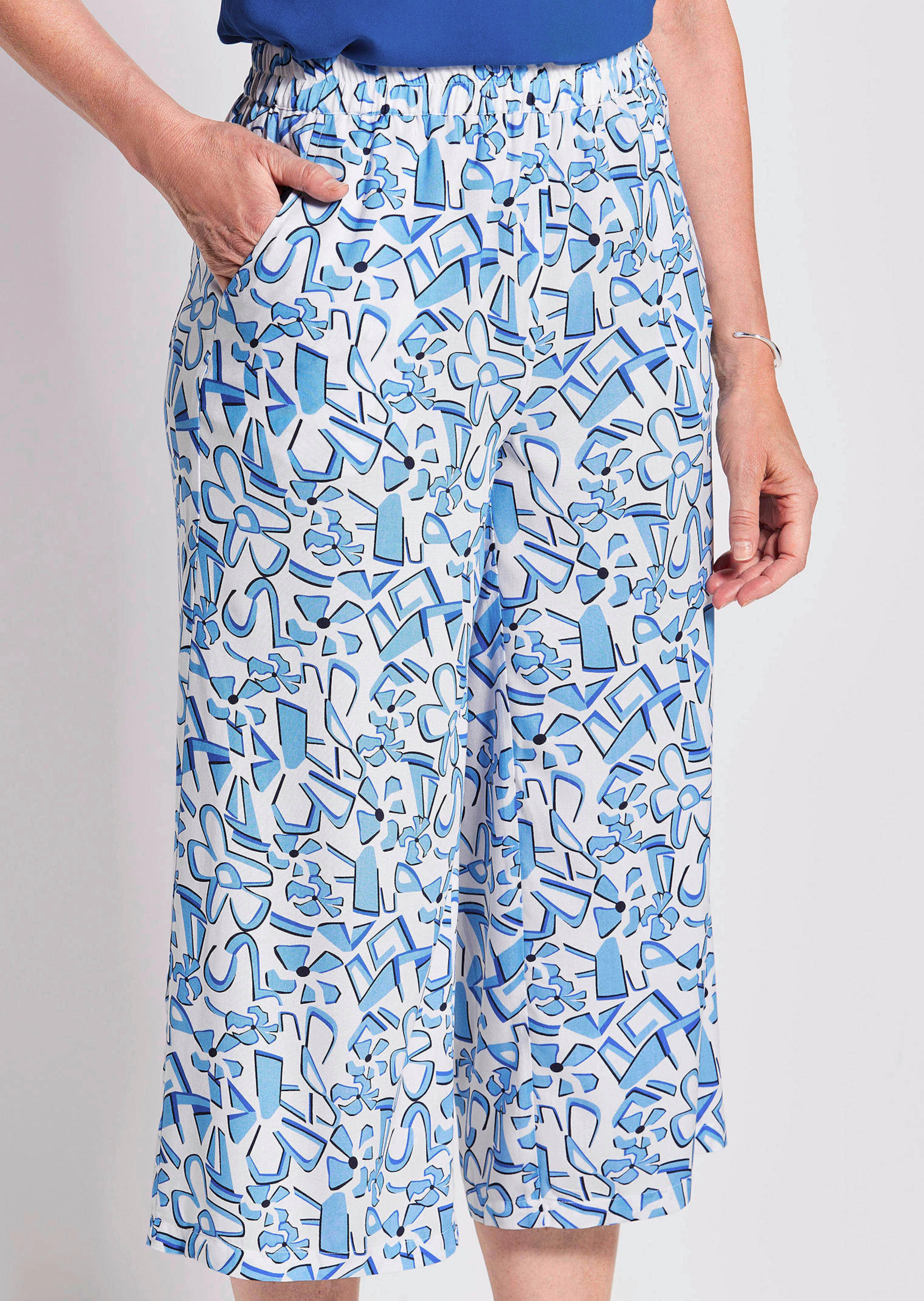Pantalon imprimé VERA à taille entièrement élastique – il offre une coupe parfaite et un grand confort. La coupe large épouse la silhouette et sa longueur raccourcie est idéale pour les journées chaudes. La viscose douce avec un imprimé harmonieux met en valeur l'aspect aérien du modèle. Largeur au bas env. 71 cm. Coupe ample.