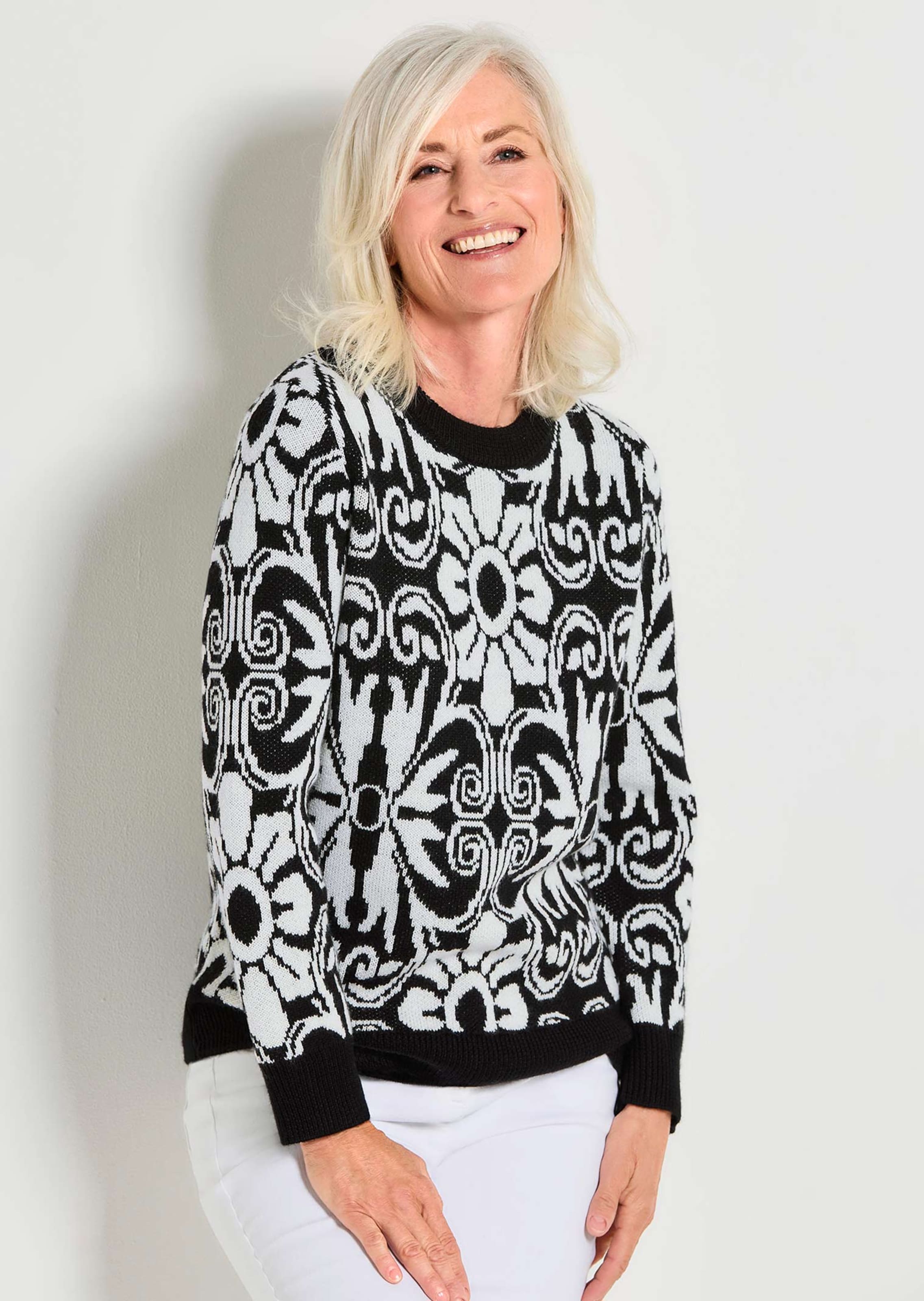 Pull en tricot agrémenté d’un motif ornemental et floral inédit. Les détails contrastants du tricot jacquard travaillé avec soin, soulignent toute l’originalité cette maille. Forme séduisante avec encolure arrondie, bas des manches et base avec bord côtes. Mix laineux, doux et bien chaud. Longueur env. 67 cm en 46, env. 63 cm en 23.