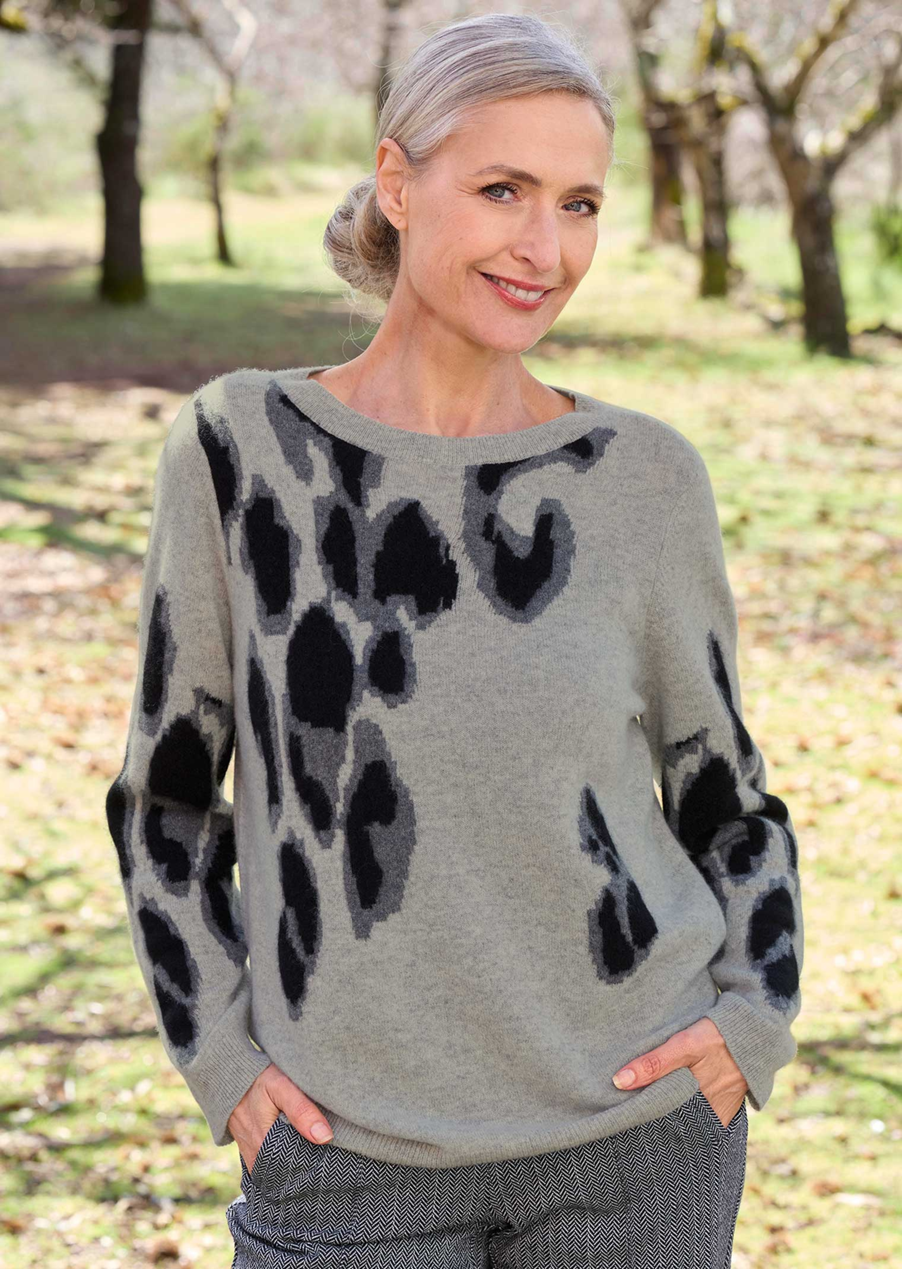 Pull en cachemire avec motif fantaisie inspiré du motif léopard. Confection soignée en maille chinée, pur cachemire, avec enchaînement subtil des coloris. Forme décontractée avec encolure bateau féminine. Base et manches longues avec bord côtes. Longueur env. 67 cm en 46, env. 63 cm en 23.