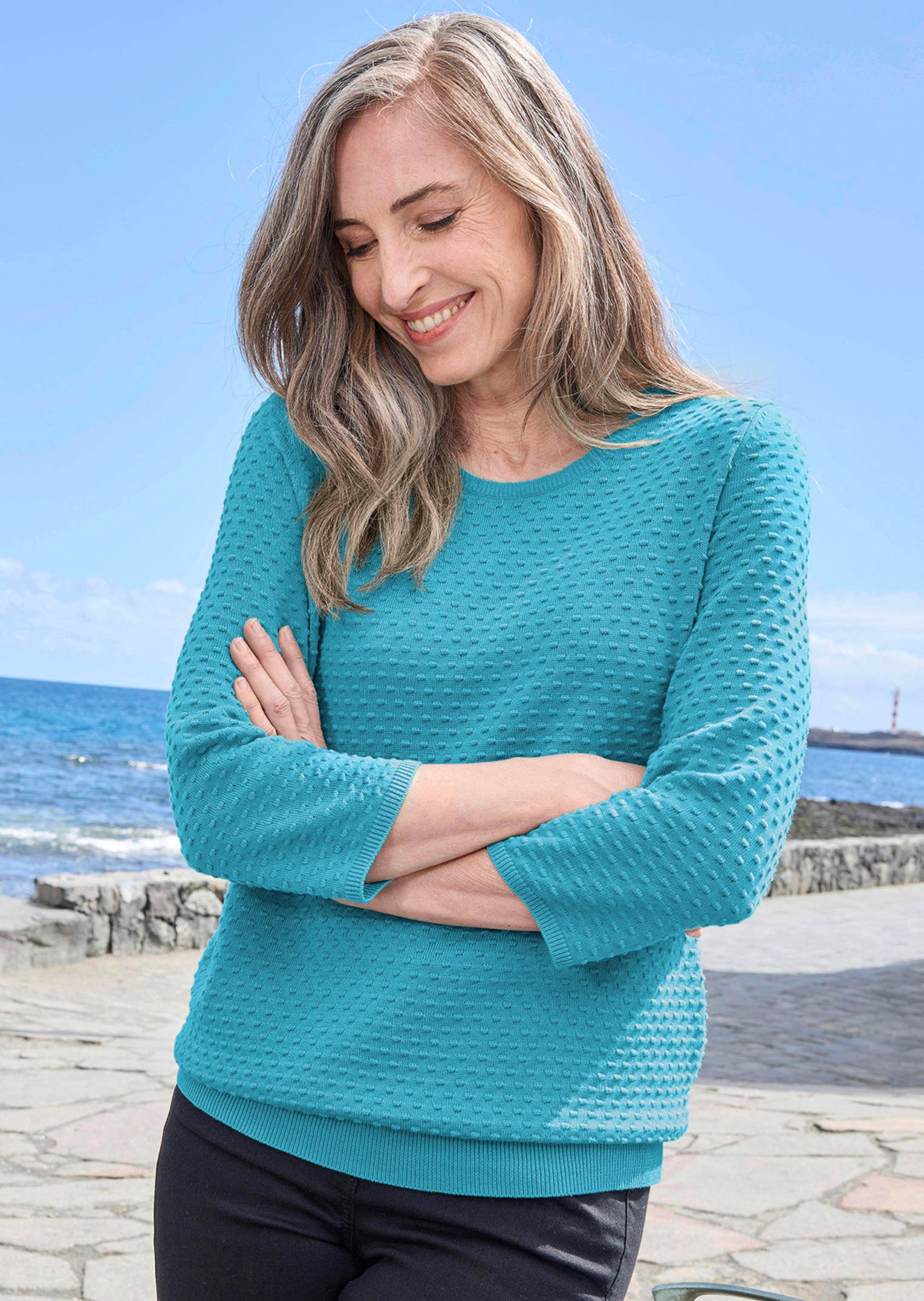 Pull en tricot à pois structuré du plus bel effet ! Pull en tricot fin, pur coton, très agréable au toucher. Confection soignée, tricotée en forme, encolure et manches 3/4 agrémentées d’un bord côtes. Longueur env. 65 cm en 46, env. 61 cm en 23.
