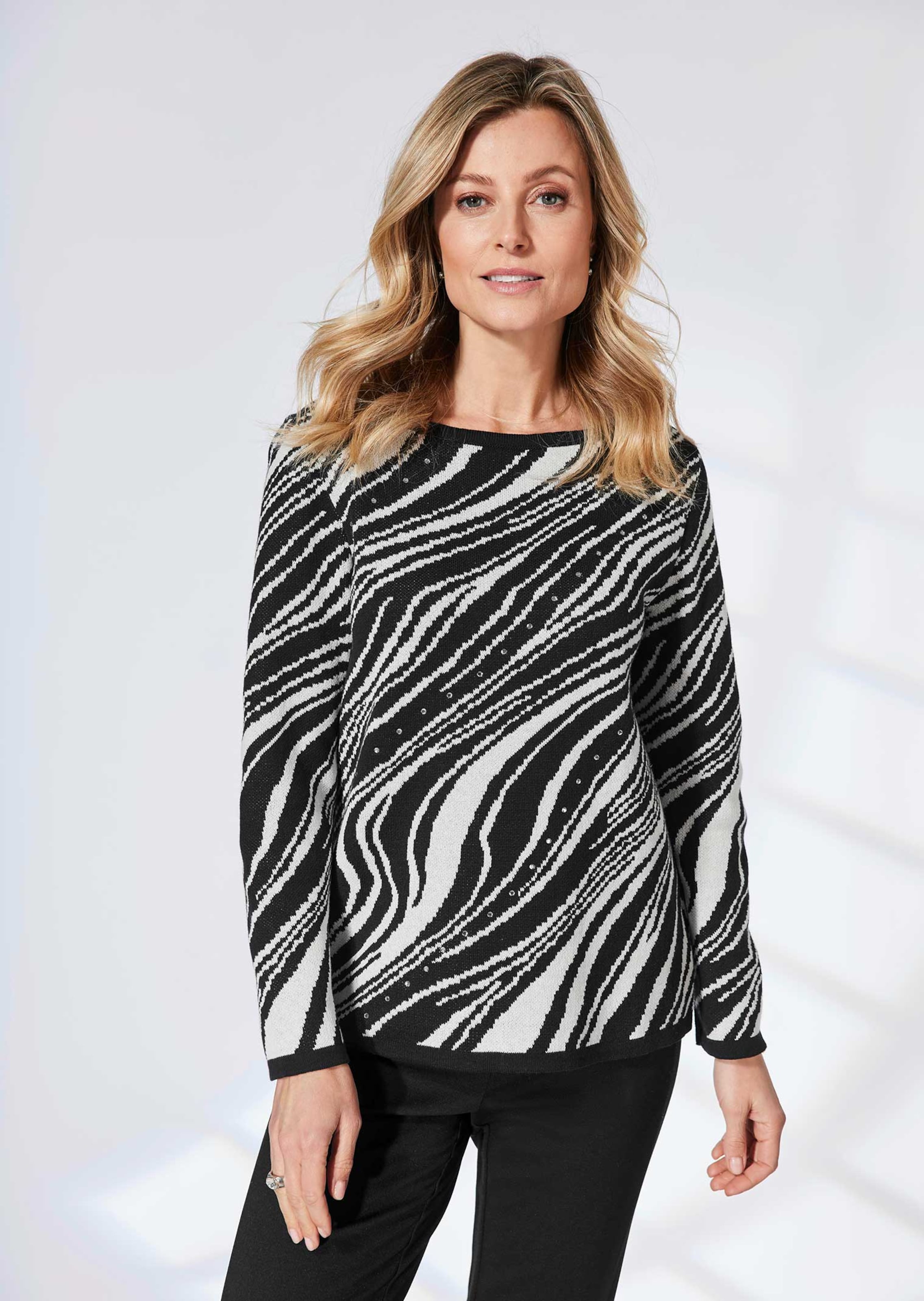Ce pull séduit par sa très belle finition et par la qualité du jacquard contrastant, rehaussé de pierres fantaisie scintillantes, appliquées à la main. La matière mélangée d'origine France, très facile d'entretien, contient un pourcentage élevé de coton, gage de douceur sur la peau. Longueur env. 67 cm en 46, env. 63 cm en 23.