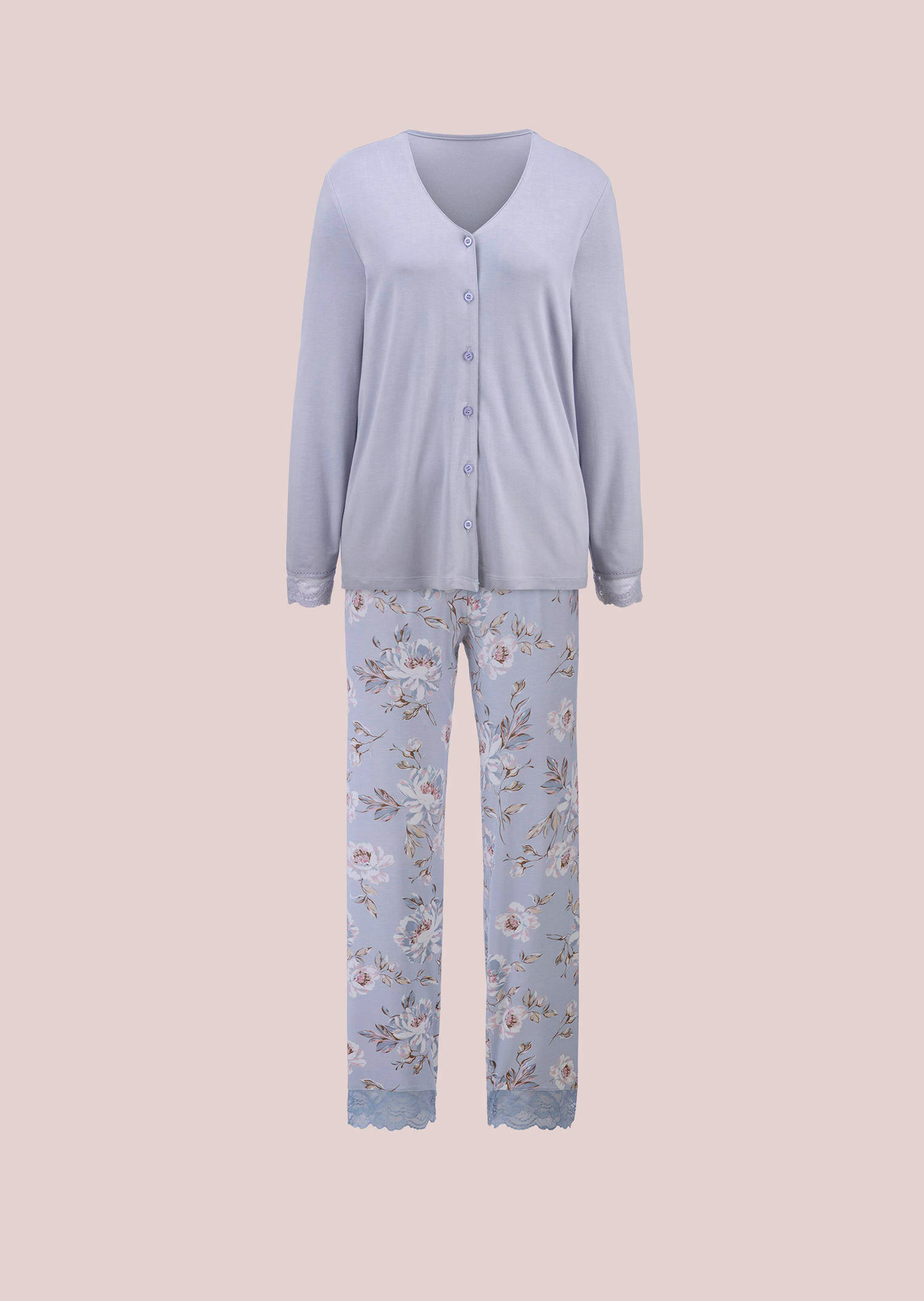 Pyjama très doux d'une tenue irréprochable, grâce à la fine matière mélangée viscose/élasthanne. Fins détails en dentelle au bas des manches et au bas des jambes. Haut uni entièrement boutonné, avec encolure en V féminine. Pantalon avec imprimé roses romantique aux couleurs harmonieuses. Taille entièrement élastique pour un tombé parfait et un excellent confort.