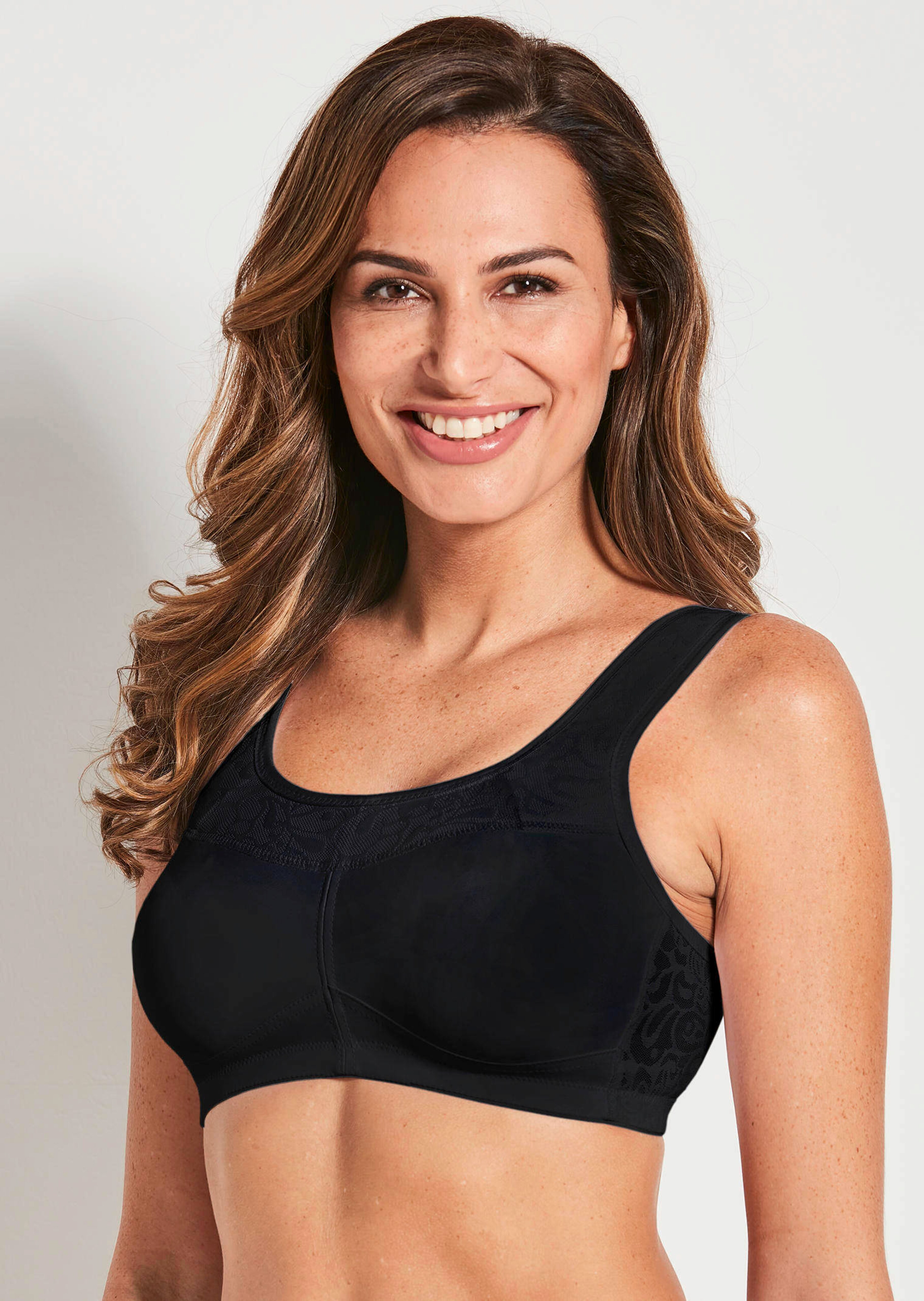 Soutien-gorge sans armatures MISS MARY. Modèle sport, idéal pour le cyclisme, le jogging ou le yoga, qui offre un maintien optimal. Forme confortable avec décolleté haut et renforts ouatés sur les côtés. Côté haut pour un maintien optimal. Avec dos en forme de U. Agrafage large au dos et bretelles ouatées, réglables garantissant un confort maximal. Les bonnets moulés lisses avec détail en dentelle ne transparaissent pas sous les vêtements.