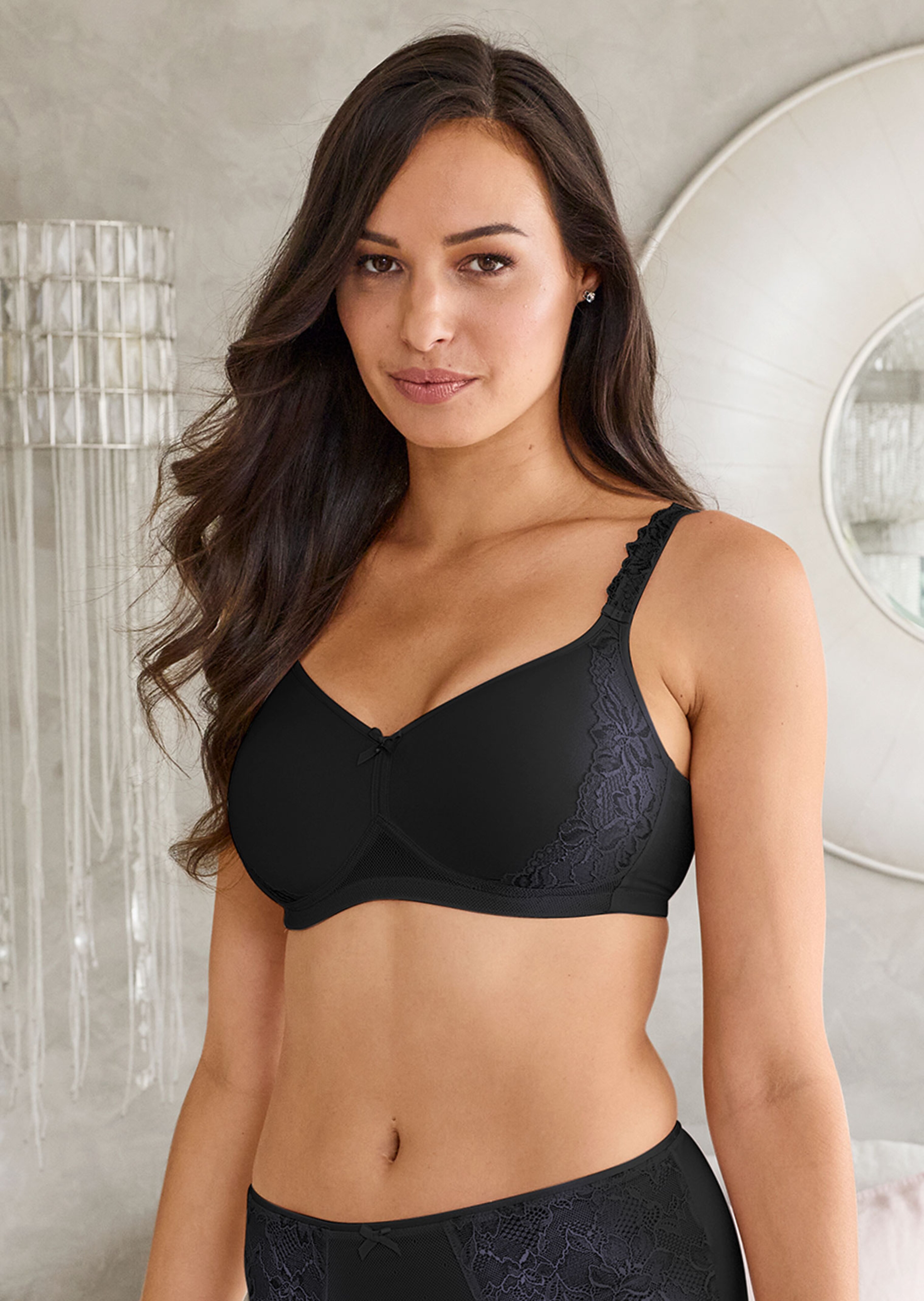 Soutien-gorge sans armatures. Confortable modèle avec bonnets spacer préformés respirants sans coutures et empiècements en dentelle sur les côtés, pour une note féminine. Avec poches dans les bonnets pour coques, coussinets ou prothèses mammaires. Bretelles réglables qui s'élargissent progressivement, avec doublure duveteuse, et dos renforcé de tulle, travaillé en double dans les grandes tailles. Fermeture réglable à 3 positions avec deux agrafes.