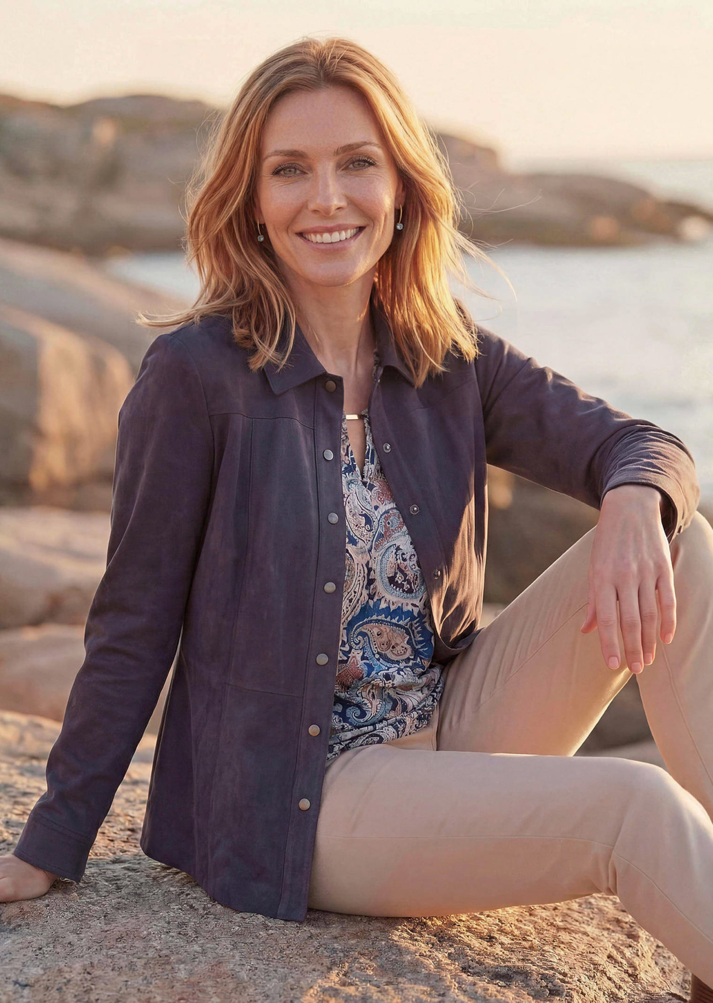 Surchemise en similicuir velours. La texture douce ravit les sens, tandis que la surchemise offre un confort exceptionnel grâce à sa matière extensible, agréable à porter. Empiècement, devant et au dos, et poignets au bas des manches. Fermeture pressionnée. Les poches latérales apportent la touche finale à ce modèle très polyvalent. Un partenaire non doublé, facile à combiner, à porter comme chemisier ou comme surchemise. Longueur env. 67 cm en 46, env. 63 cm en 23.