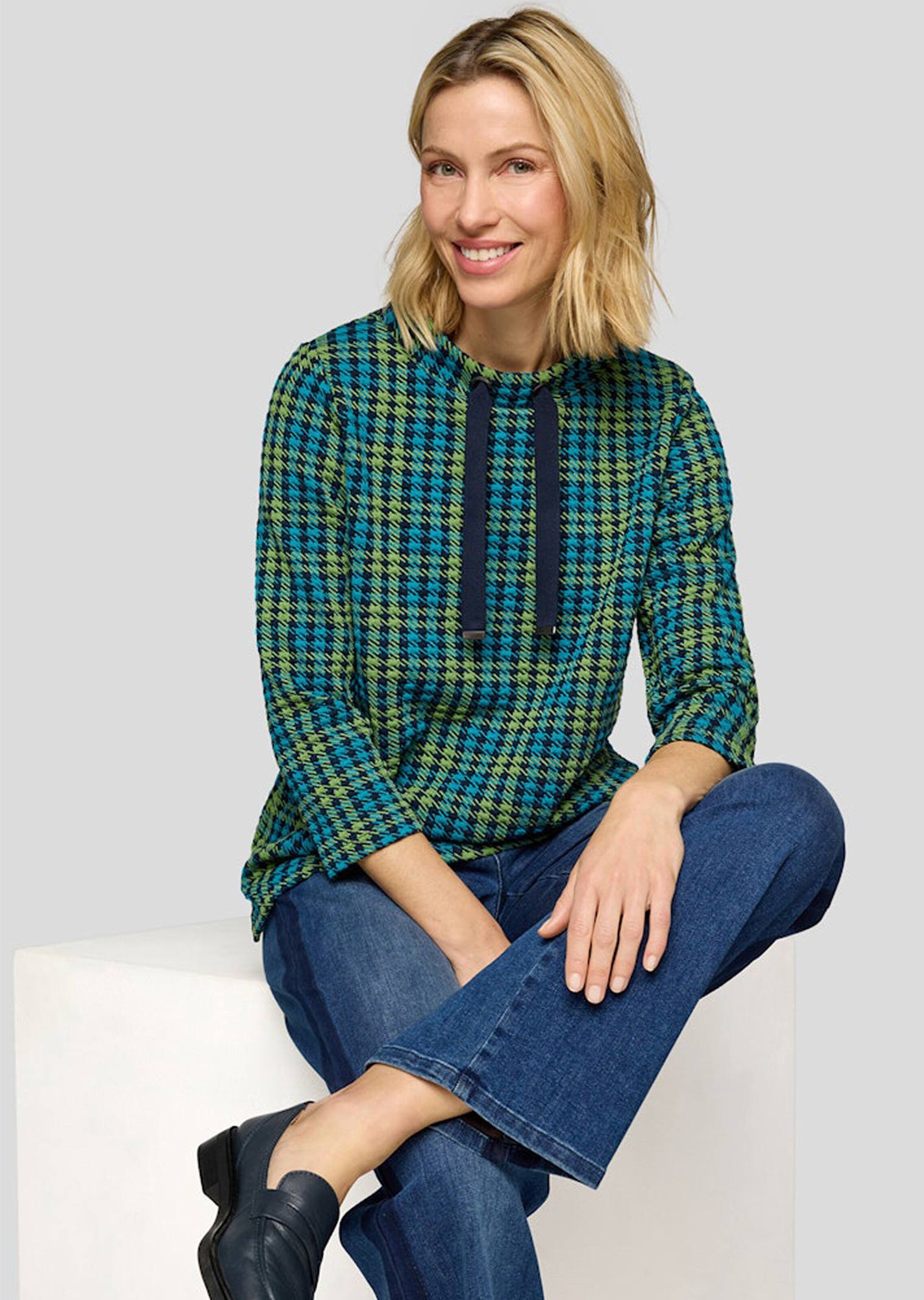 T-shirt jacquard de RABE parcouru d'un motif pied-de-poule classique, revisité grâce à une surface en jersey texturé qui lui donne une toute nouvelle dimension. Allure sport avec col montant légèrement éloigné du cou et liens décoratifs. Fentes au bas sur les côtés, manches 3/4. Longueur env. 66 cm en 46.