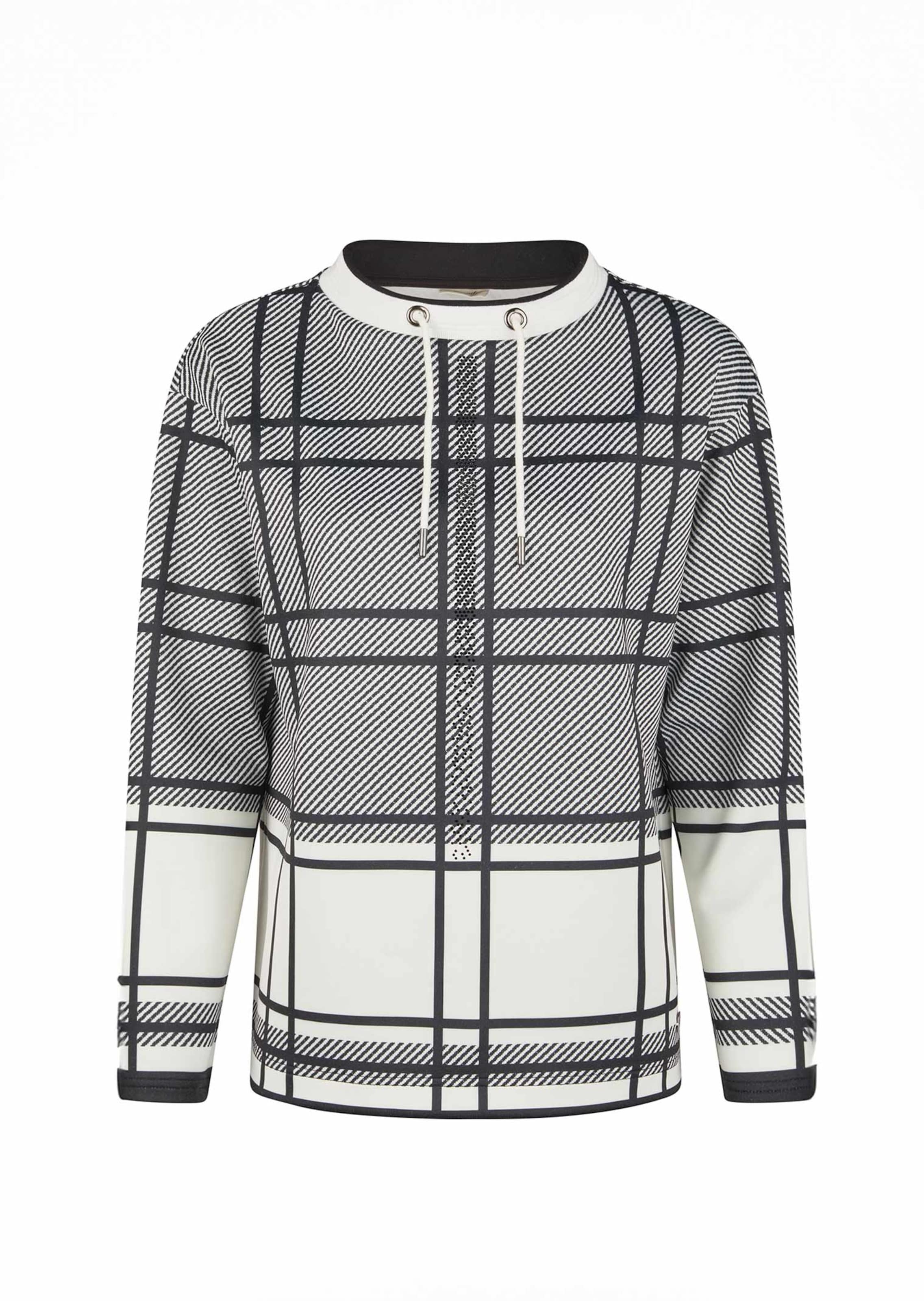 Sweat-shirt BARBARA LEBEK avec motif à carreaux contrastant. La bande verticale ornée de strass sur le devant attire tous les regards ! Look décontracté avec bord en tricot avec lien de serrage à l’encolure arrondie. Petites fentes latérales à la base. Matière légère et bien lisse. Longueur env. 65 cm en 46.