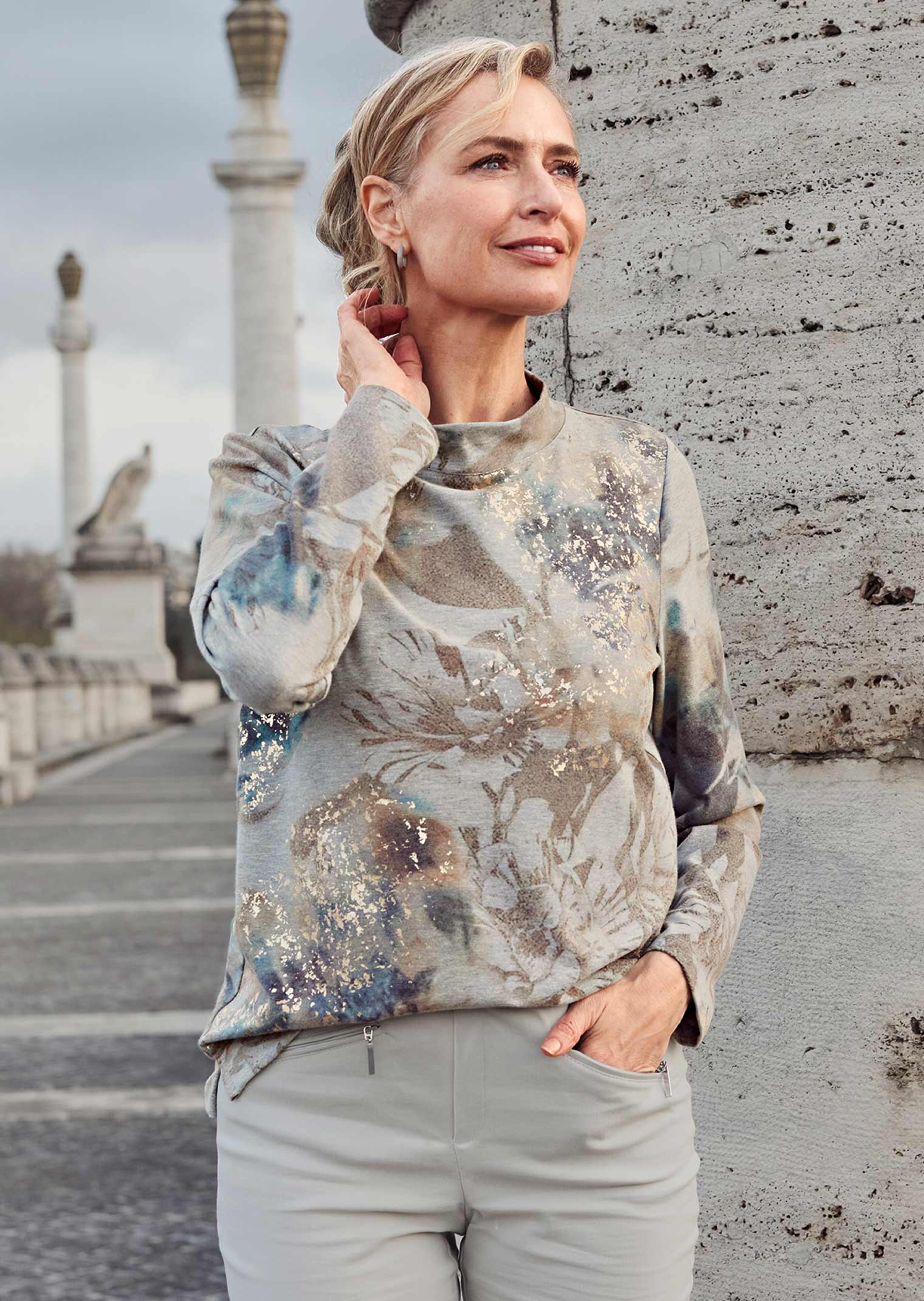 Sweat chic et décontracté agrémenté, à l'avant, de détails imprimés légèrement brillants. Col montant dégagé et manches longues. Fentes sur les côtés pour une liberté de mouvements maximale. Longueur flatteuse qui couvre les hanches. Un haut raffiné, polyvalent et confortable, coupé dans un jersey agréable à porter avec teneur en coton, qui se combine à merveille avec une jupe ou un pantalon uni. Longueur env. 66 cm en 46, env. 62 cm en 23.