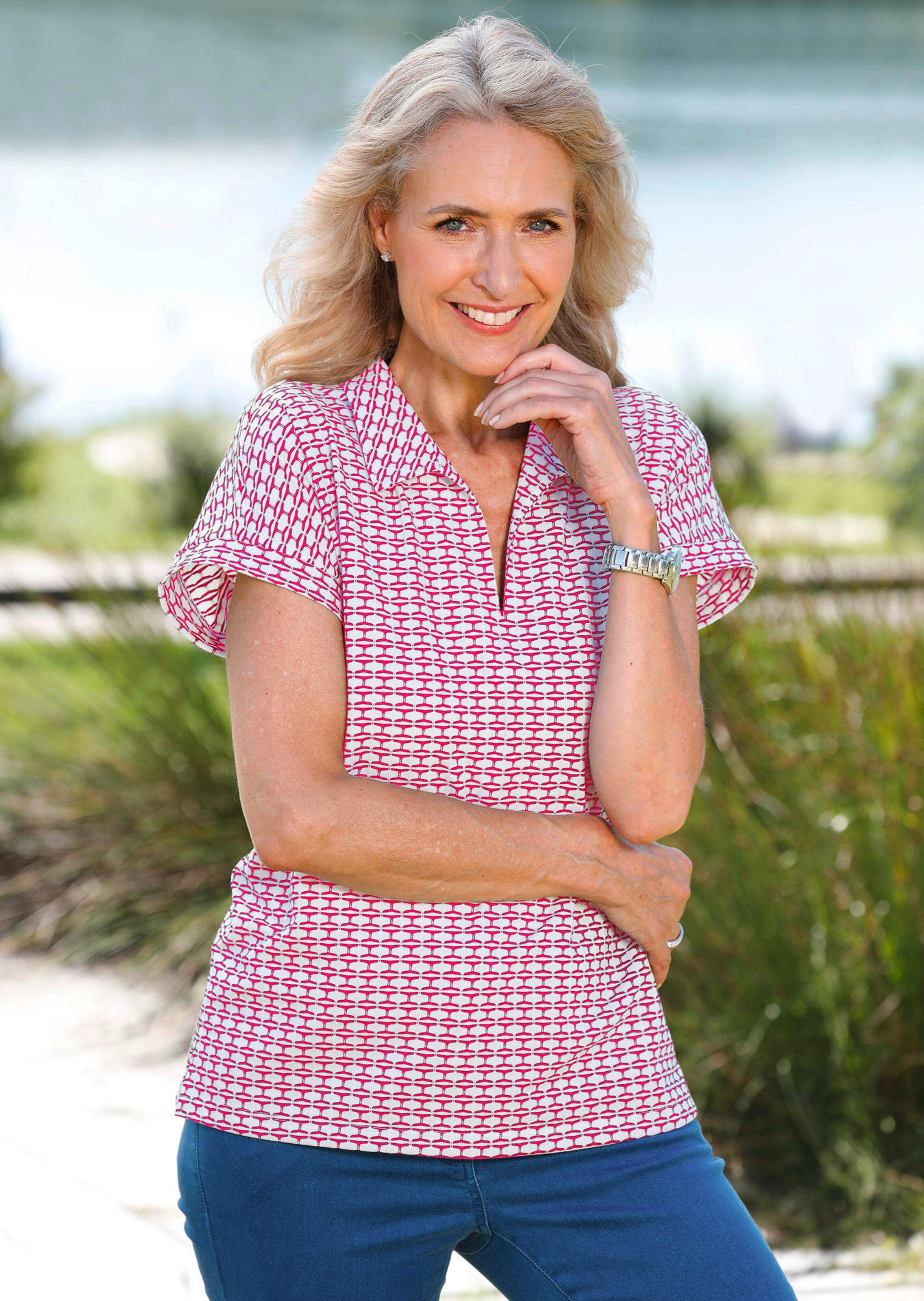 Un motif jacquard contrastant, mais sobre, anime ce T-shirt en jersey de viscose extensible, une matière légèrement structurée, très agréable à porter, qui contient de la viscose. La coupe droite, les fentes sur les côtés et la longueur sur les hanches dessinent une silhouette moderne. Encolure en V, col polo, épaules tombantes, petite patte aux emmanchures. Longueur env. 64 cm en 46, env. 60 cm en 23.