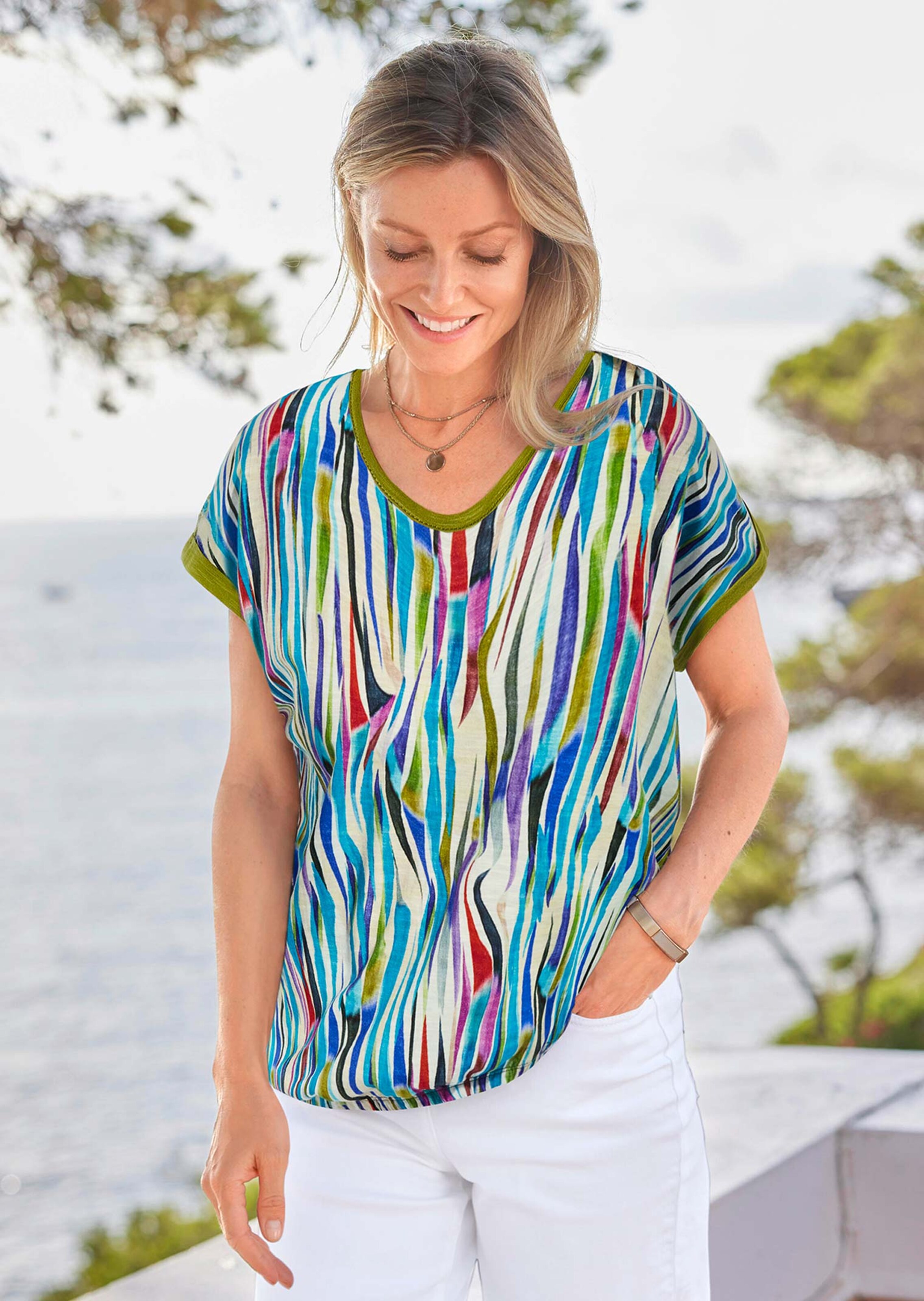 T-shirt séduisant, confectionné dans une belle matière flammée. Look chic et décontracté avec emmanchures tombantes et petit revers raffiné au bas des manches. Le décolleté actuel qui séduit d’emblée, lui confère élégance et modernité. Imprimé séduisant sur le devant, et dos uni ton sur ton harmonieux. En coton. Longueur env. 66 cm en 46, env. 62 cm en 23.