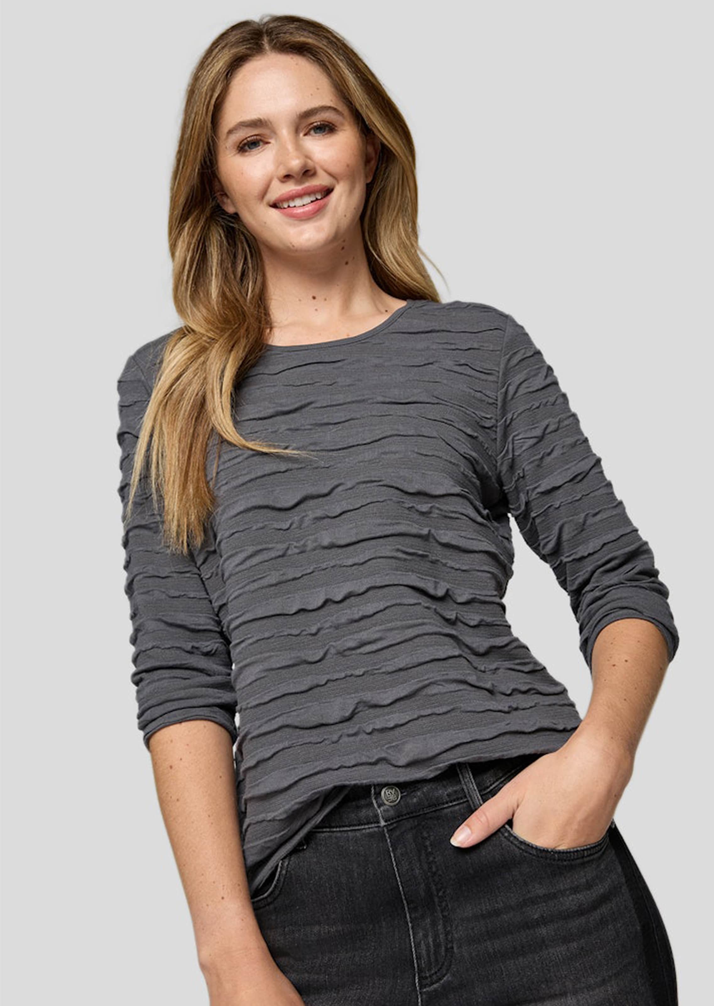 T-shirt structuré RABE en jersey de viscose, agréable à porter. Entretien aisé. Modèle facile à combiner pour tous les jours avec motif ondulé à effet 3D. Coupe droite avec encolure arrondie et manches 3/4. Facile à associer avec un jean, un pantalon ou une jupe élégante. Longueur env. 66 cm en 46.