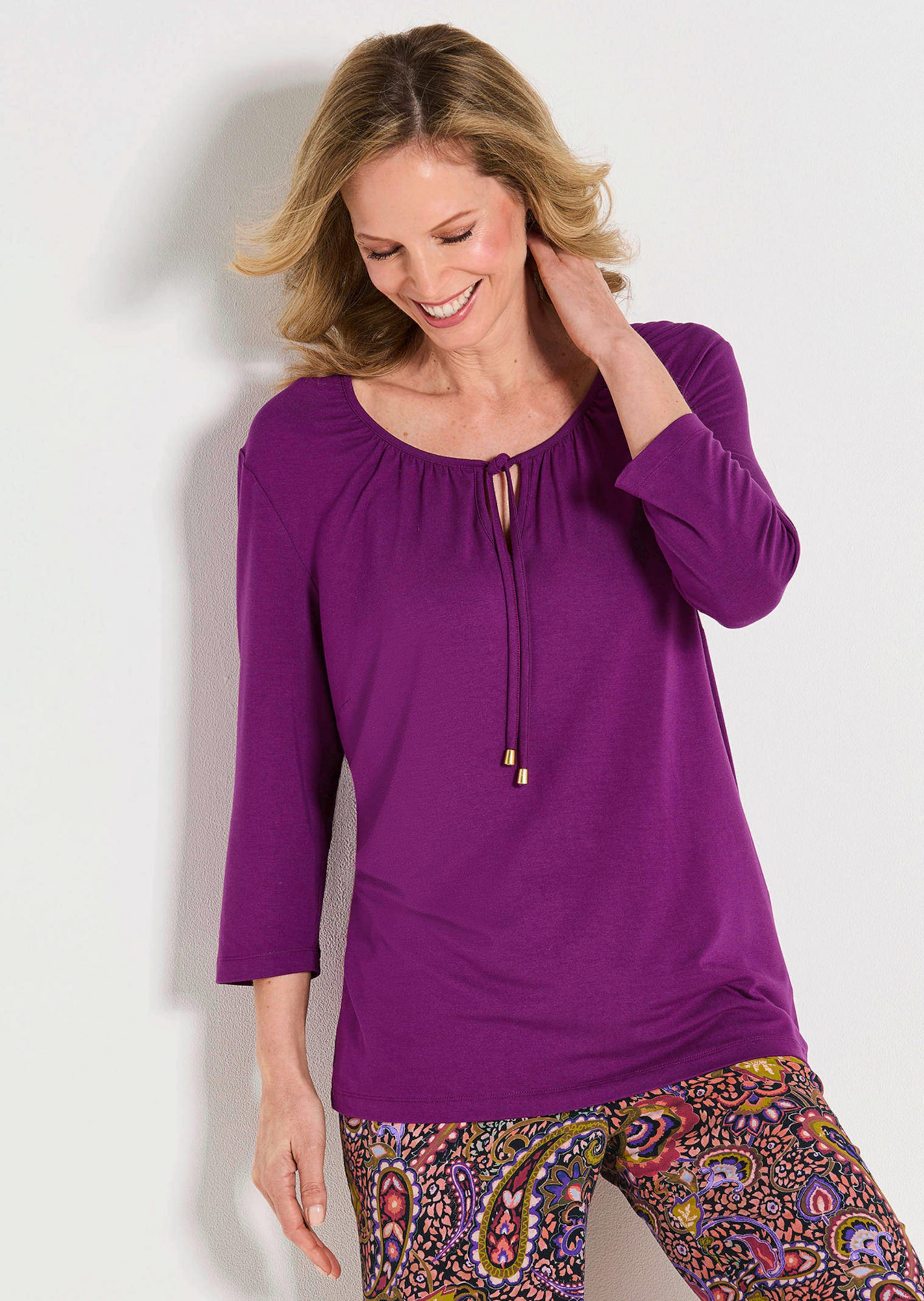 T-shirt agrémenté de détails raffinés : encolure arrondie joliment plissée avec petite fente et liens à nouer. Coupe flatteuse avec manches 3/4. T-shirt en jersey de viscose extensible, très agréable au toucher. Longueur env. 66 cm en 46, env. 62 cm en 23.