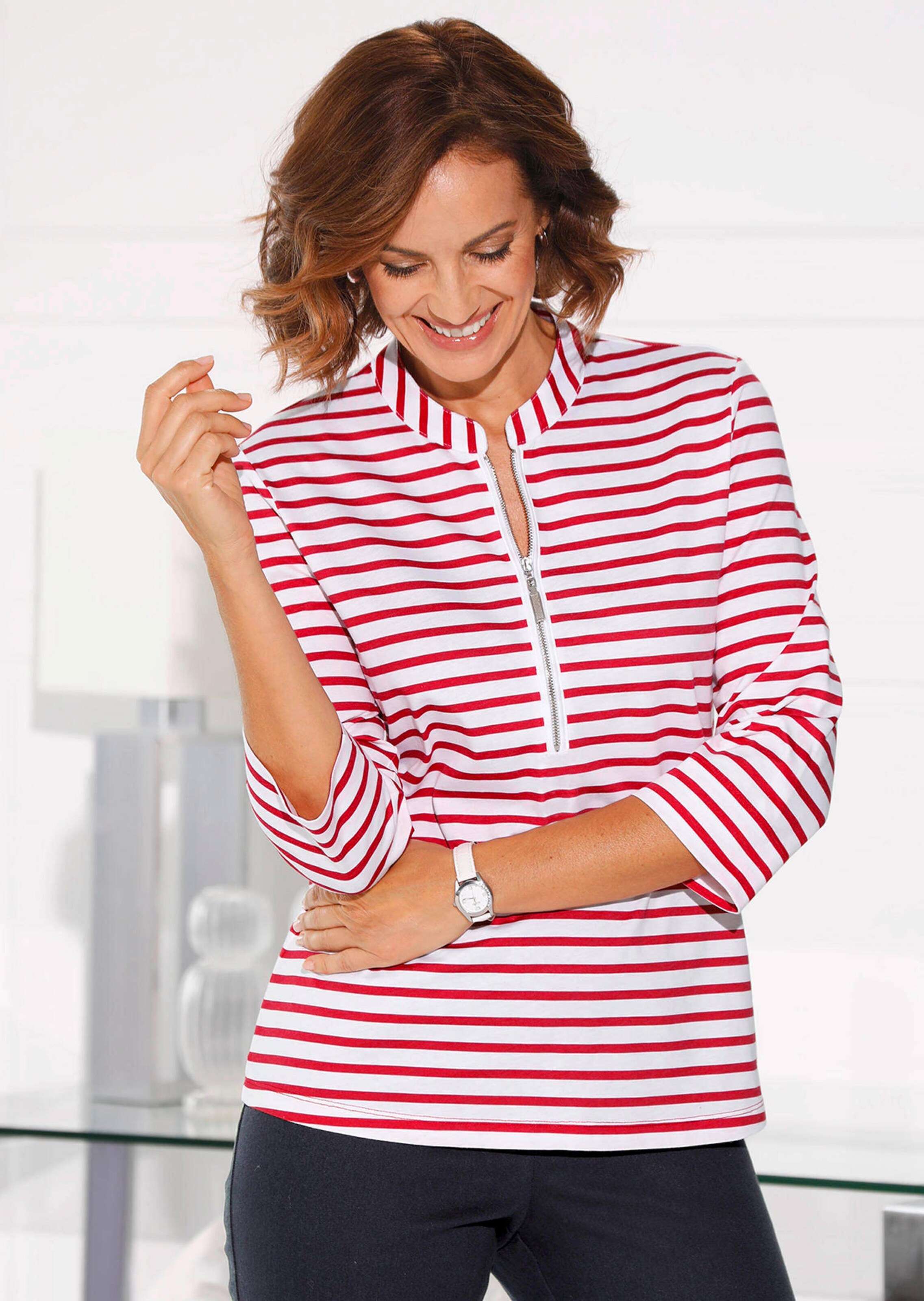 Ce T-shirt rayé se compose de pur coton et sa coupe longue fait des merveilles. Petit col droit avec zip, manches 3/4 pouvant être retournées à l'aide d'un bouton et d'une bride. Longueur env. 67 cm en 46, env. 63 cm en 23.