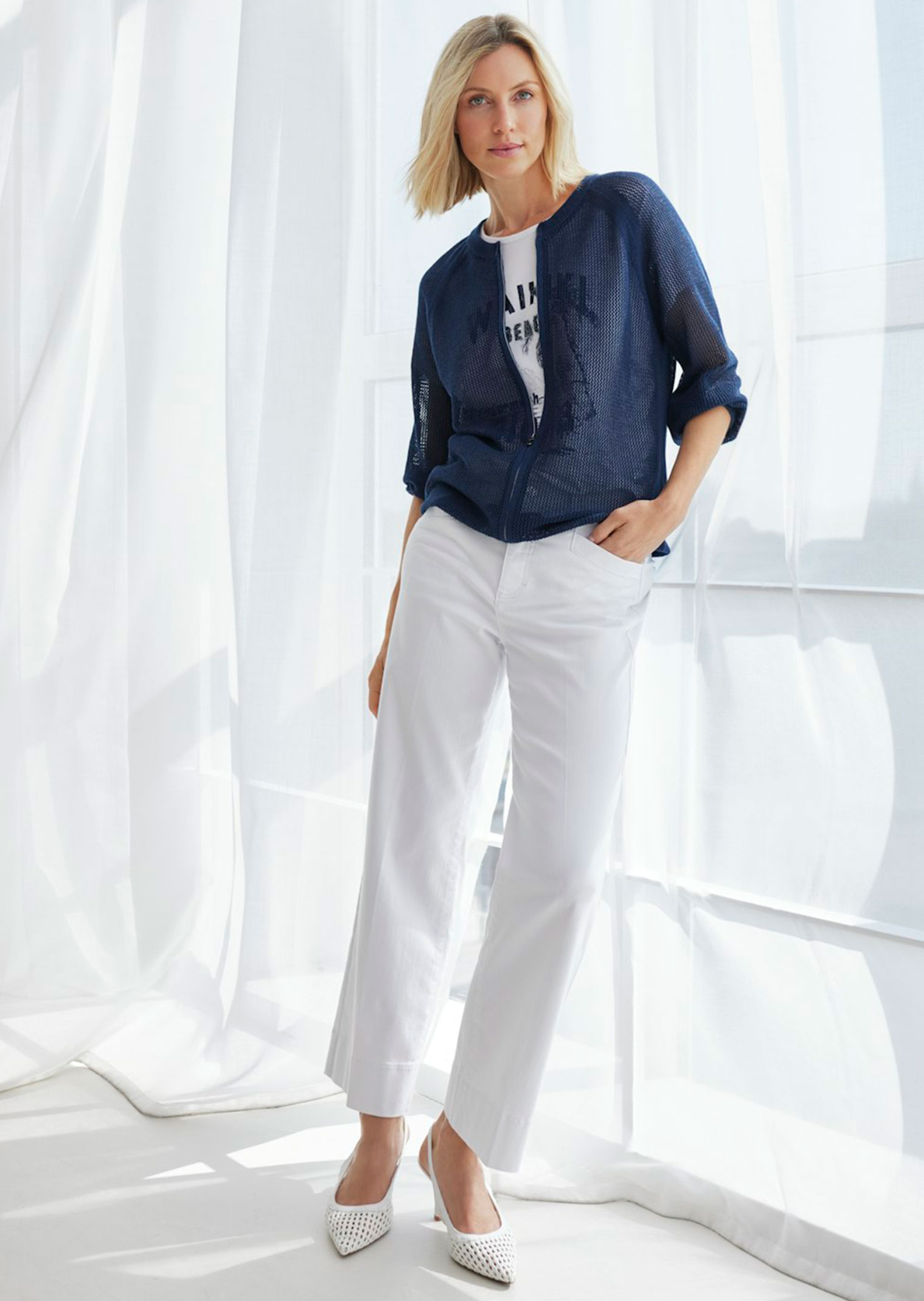Veste en tricot RABE. Belle maille transparente et aérée qui laisse transparaître la peau… Un modèle estival, séduisant, facile à combiner. Des parties opaques sur les côtés, au niveau de la fermeture zippée et aux finitions côtelées, ainsi que le fil brillant ajoutent du peps à l'ensemble. Confort maxi, avec manches raglan 3/4, encolure arrondie et zip. Base réglable par lien de serrage sous coulisse. Réalisé dans un mix léger avec teneur en coton. Longueur env. 66 cm en 46.