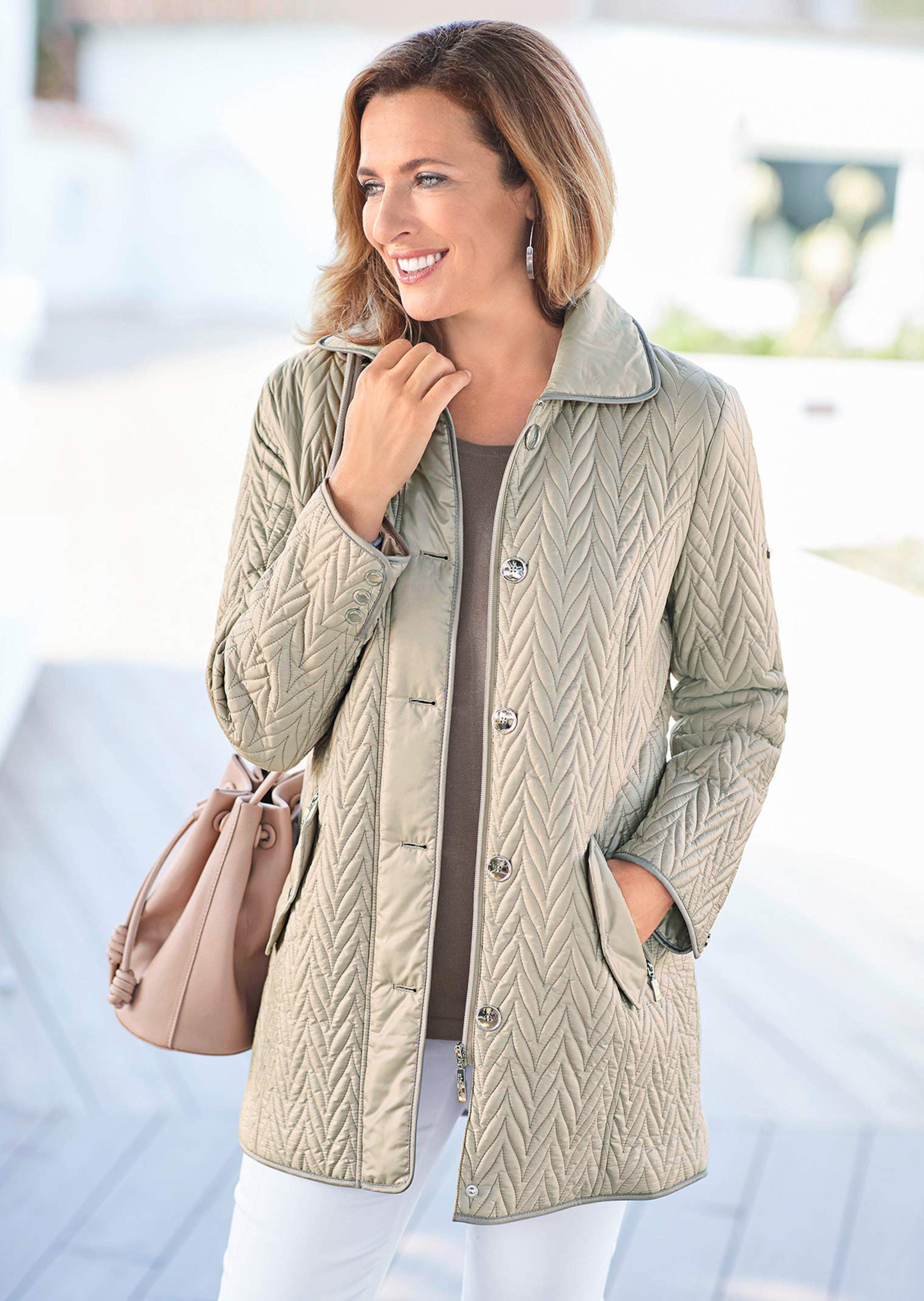 Longue et légèrement ouatinée, cette veste matelassée est idéale par temps frais. Des coutures princesse à l'avant et dans le dos lui assurent un tombé impeccable et un passepoil contrastant souligne élégamment les bords et la patte de boutonnage qui double la fermeture par zip et vous protège efficacement du vent. Petite fente et trois boutons-pression au bord des manches, deux poches zippées, poche intérieure, poche pour téléphone mobile, boutons-pression et zip. Longueur env. 83 cm en 46, env. 79 cm en 23.