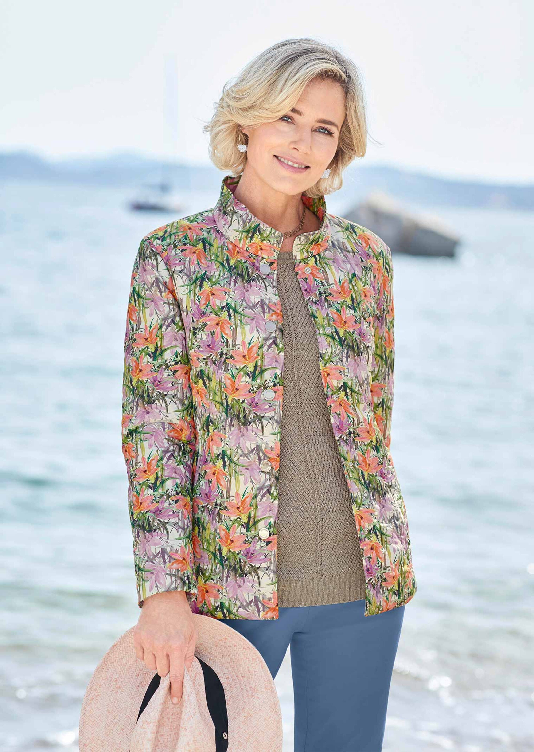 Cette veste matelassée doit son look moderne à un imprimé floral aux coloris lumineux. Légèrement ouatinée, elle vous rendra d'inestimables services, y compris en été. Des coutures princesse lui assurent un tombé parfait et valorisent la silhouette. Boutons-pression, col rabattu, deux profondes poches extérieures, une poche intérieure et une poche pour téléphone mobile. Longueur env. 71 cm en 46, env. 67 cm en 23.