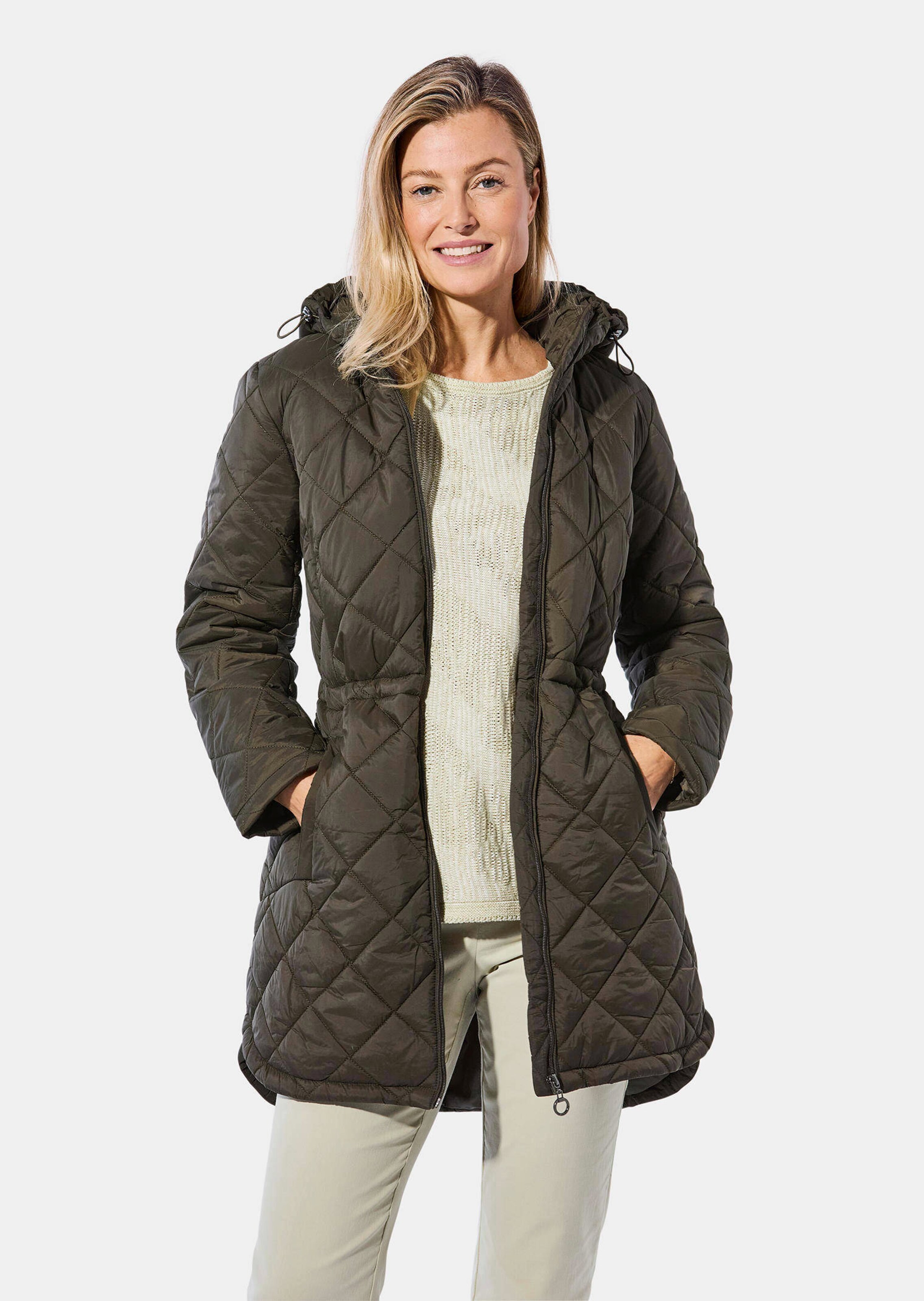 Veste matelassée au look décontracté, avec base flatteuse plus longue au dos. Votre complice idéal pour les journées froides de l'automne et de l'hiver. Veste doublée avec surpiqûres en losange, fermeture zippée et col montant bien chaud. La capuche vous protège du vent et de la pluie. Silhouette féminine avec taille élastiquée réglable selon les besoins, les envies ou le style souhaité. Poches latérales pratiques. Taille petit : veuillez commander une taille au-dessus de votre taille habituelle.